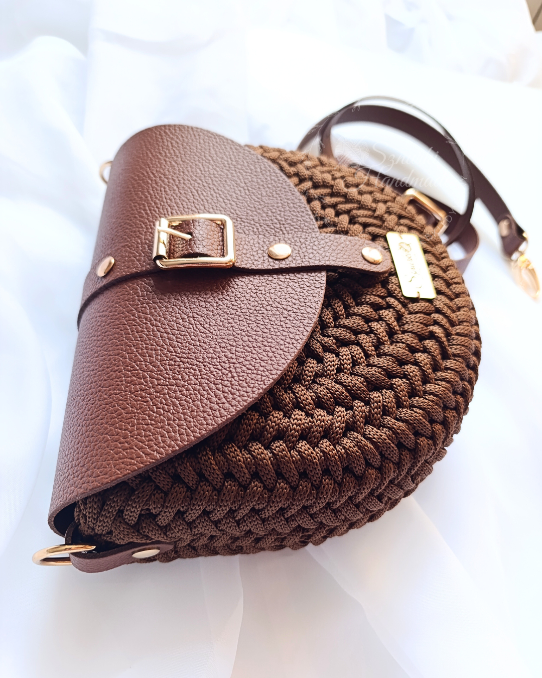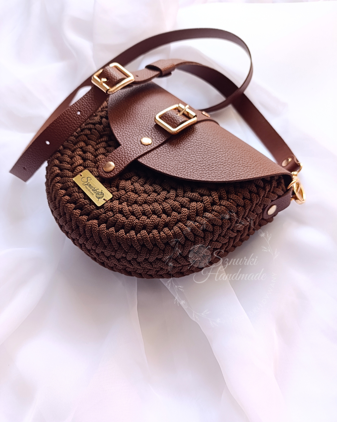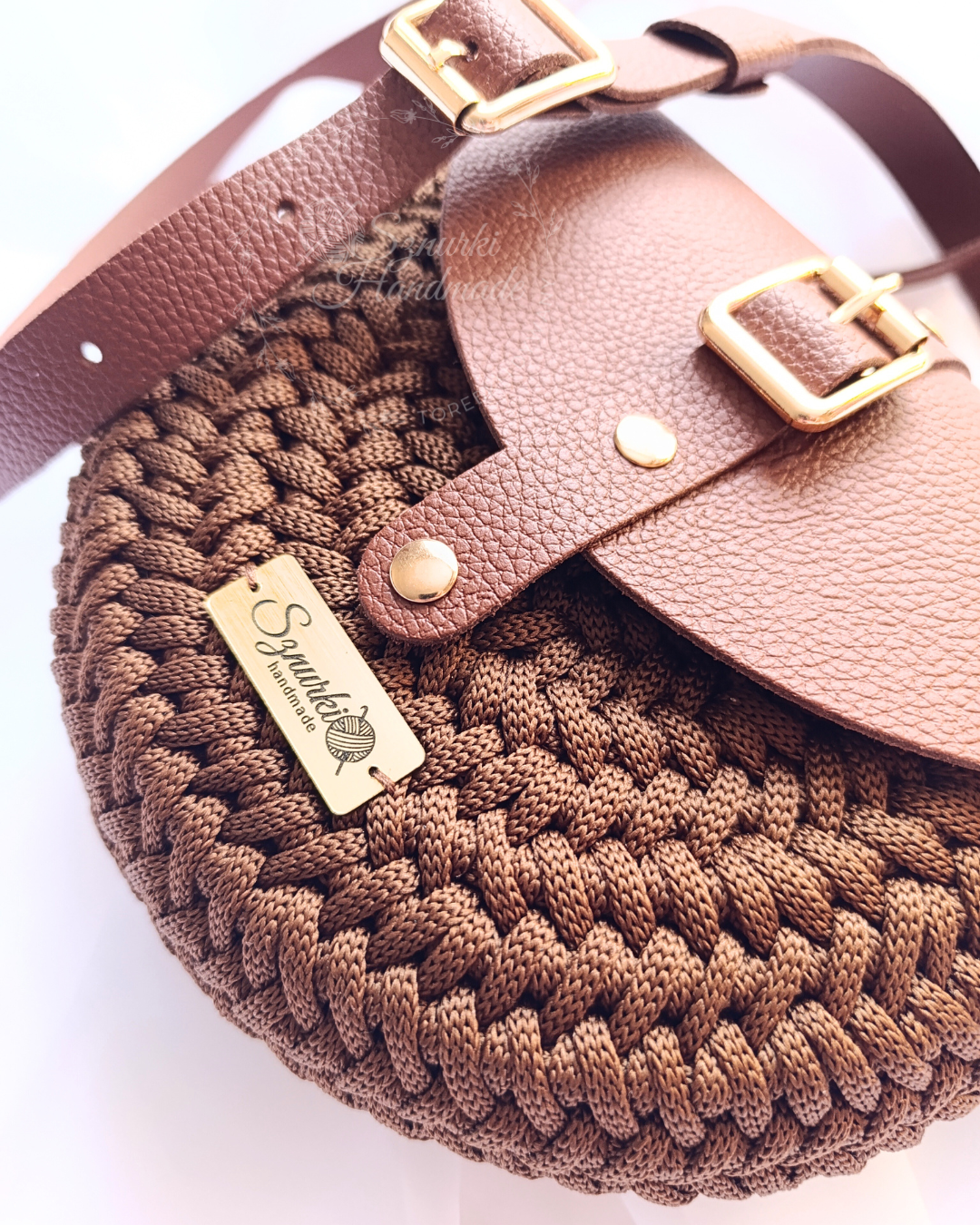 Model ręcznie szydełkowany, z elementami ze skóry naturalnej.
