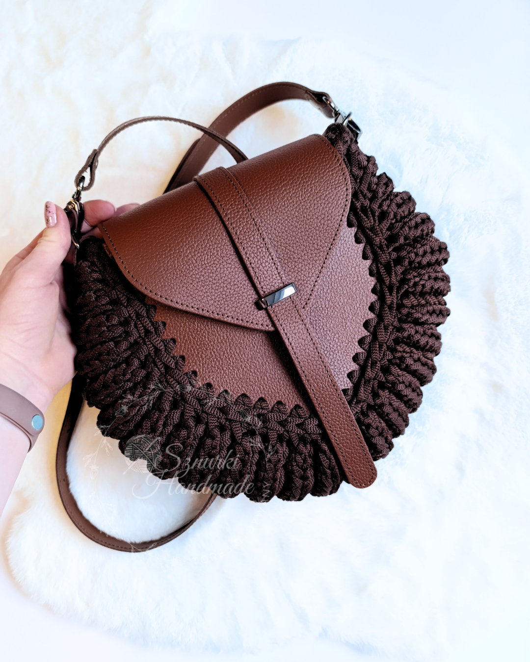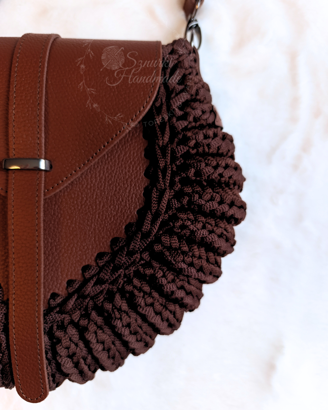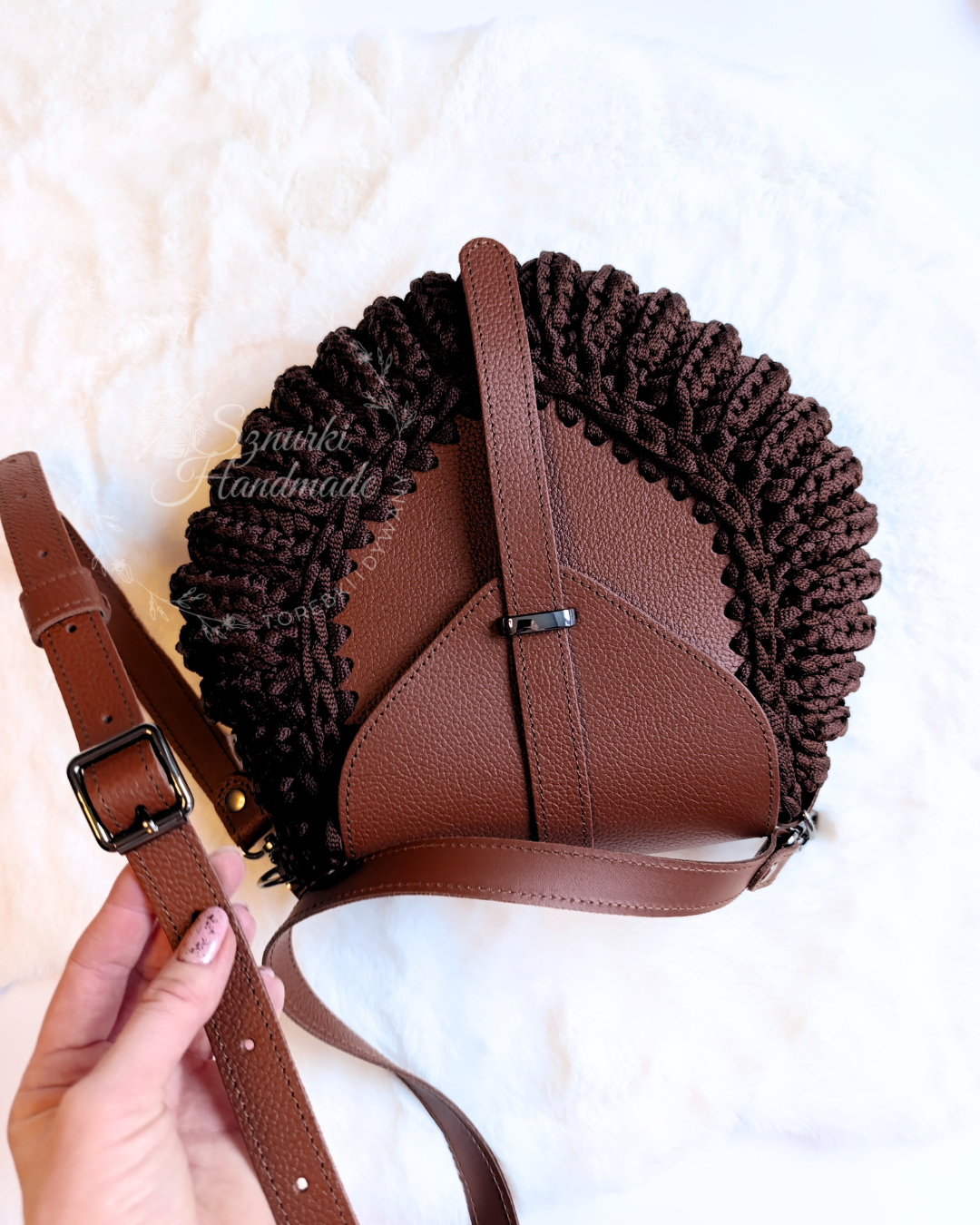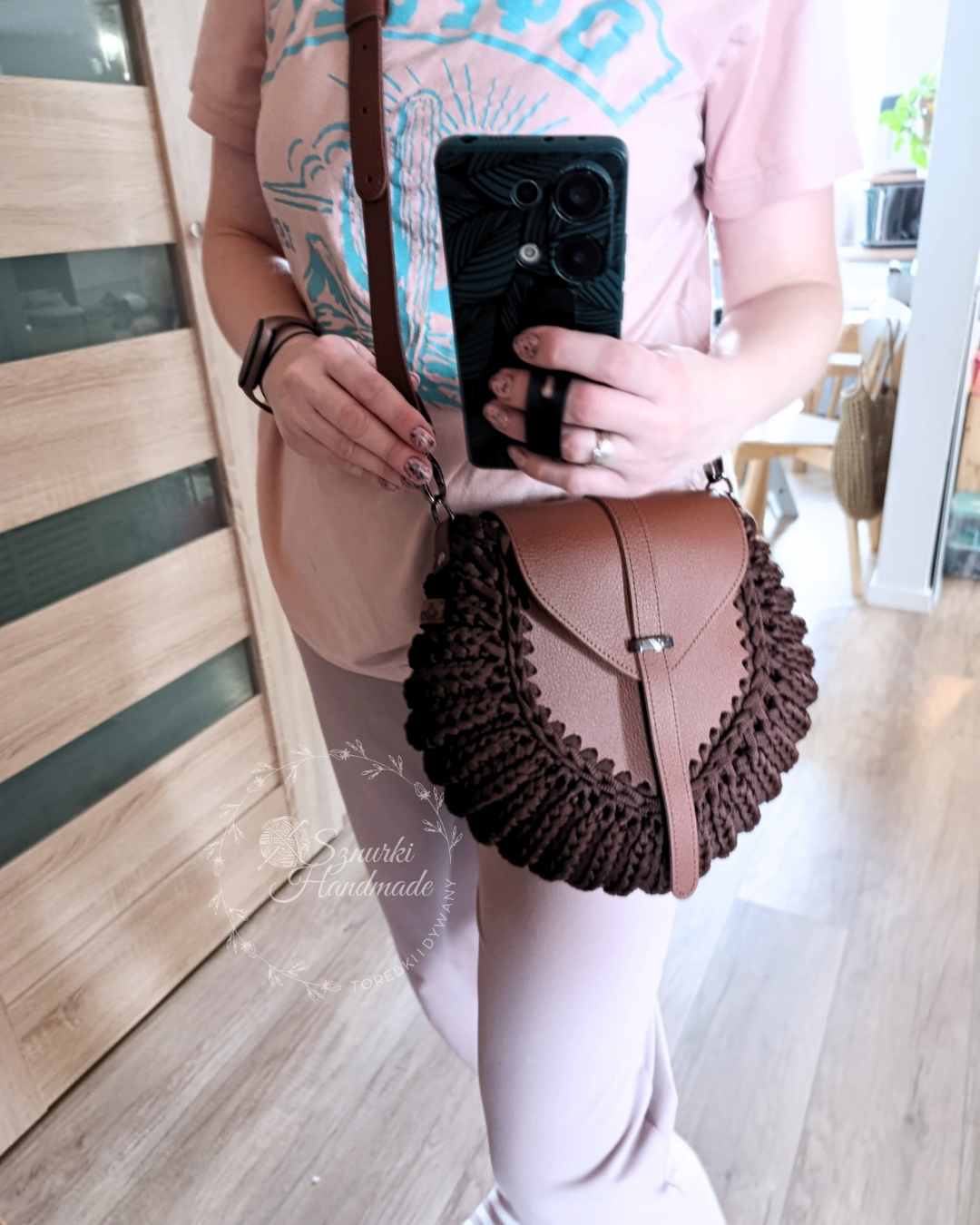 Model ręcznie szydełkowany, z elementami ze skóry naturalnej.
