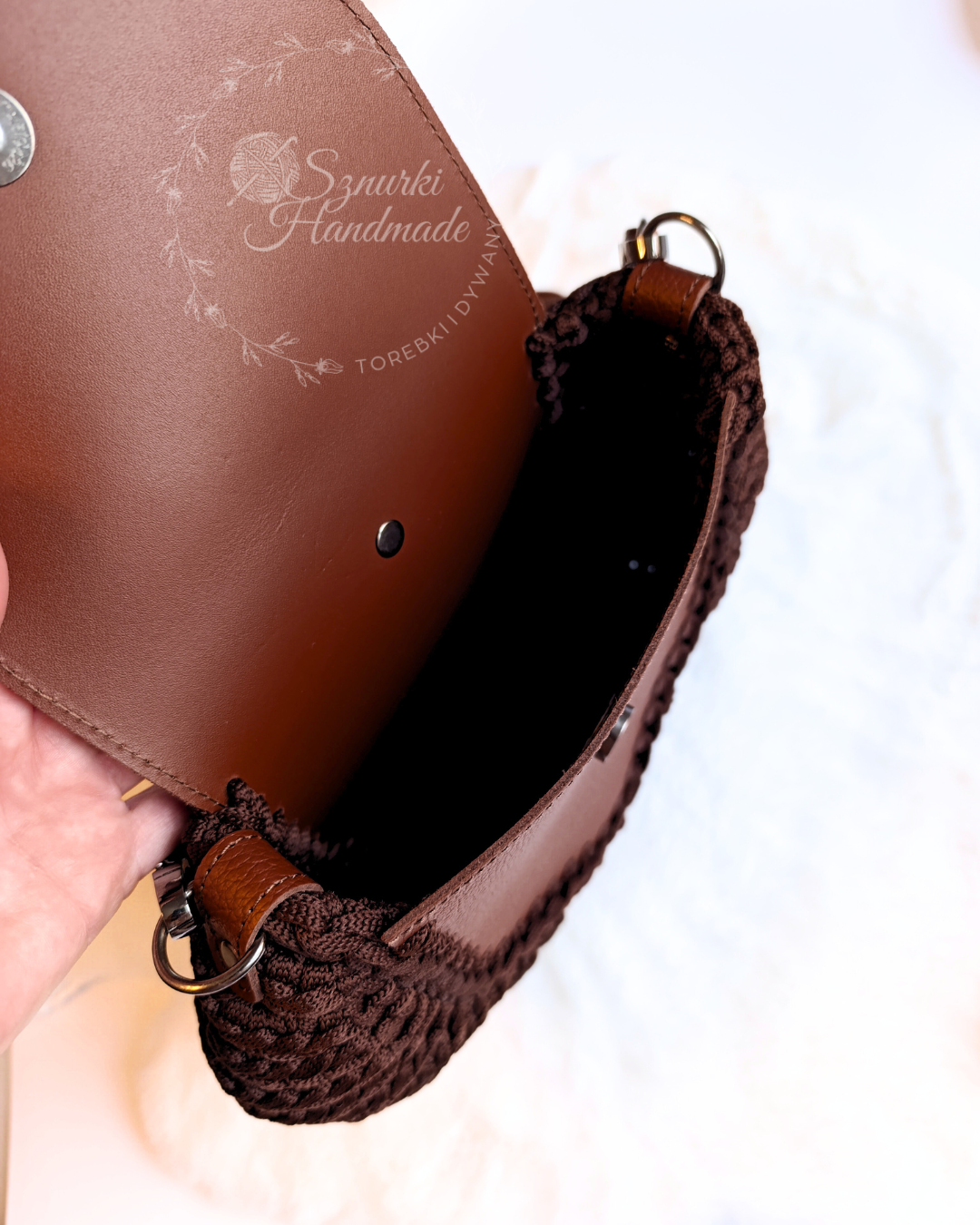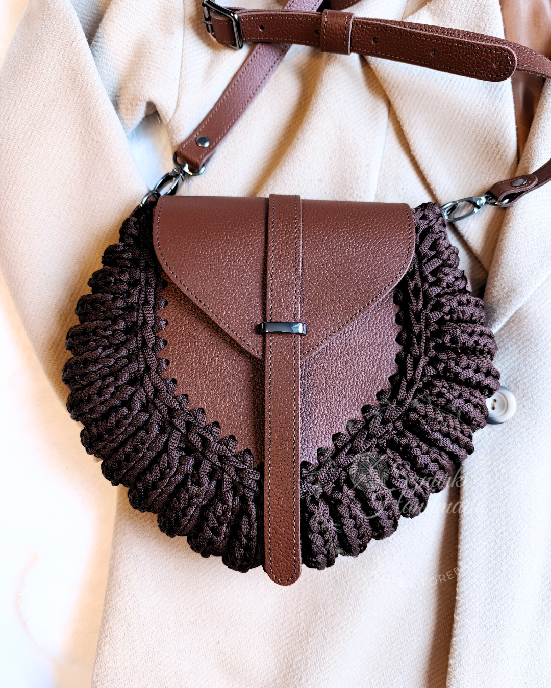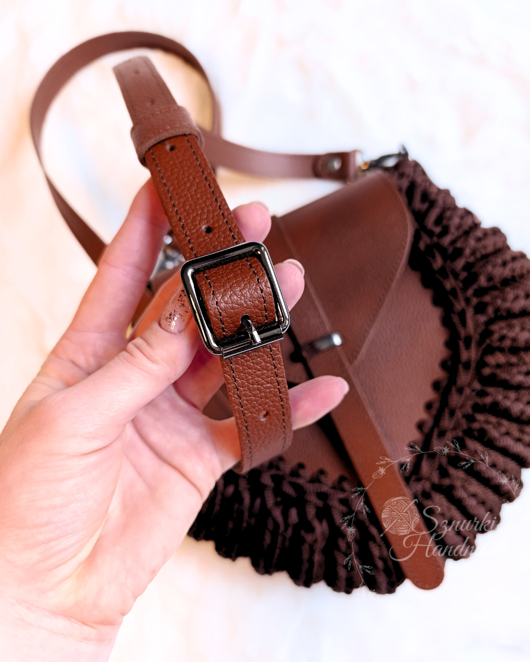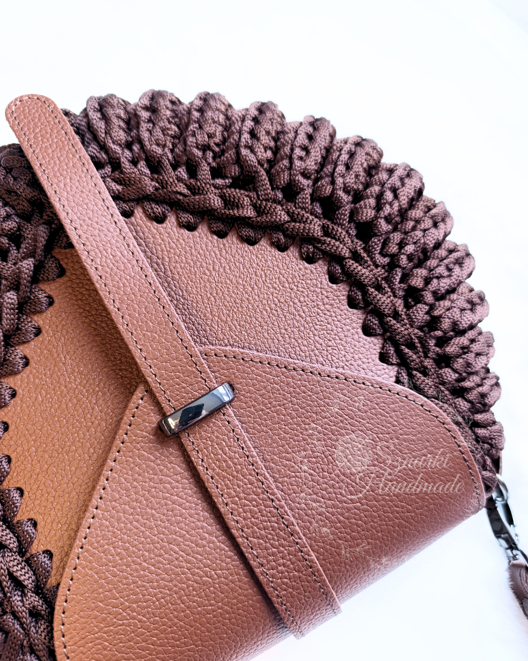 Model ręcznie szydełkowany, z elementami ze skóry naturalnej.