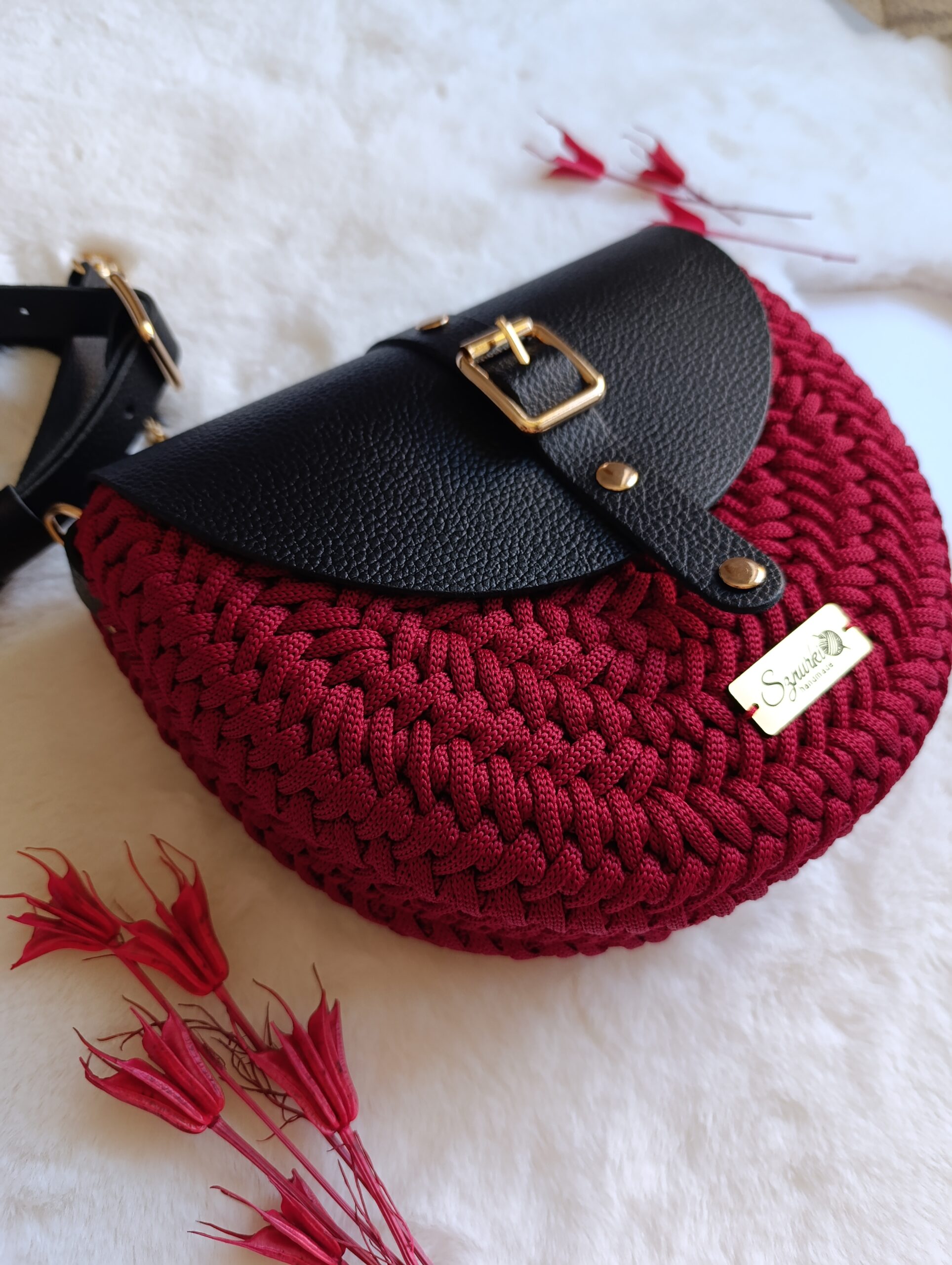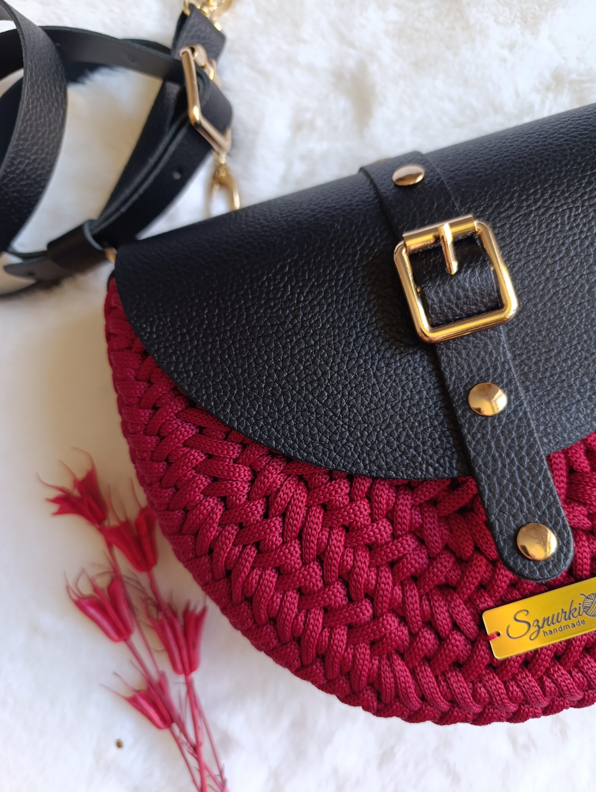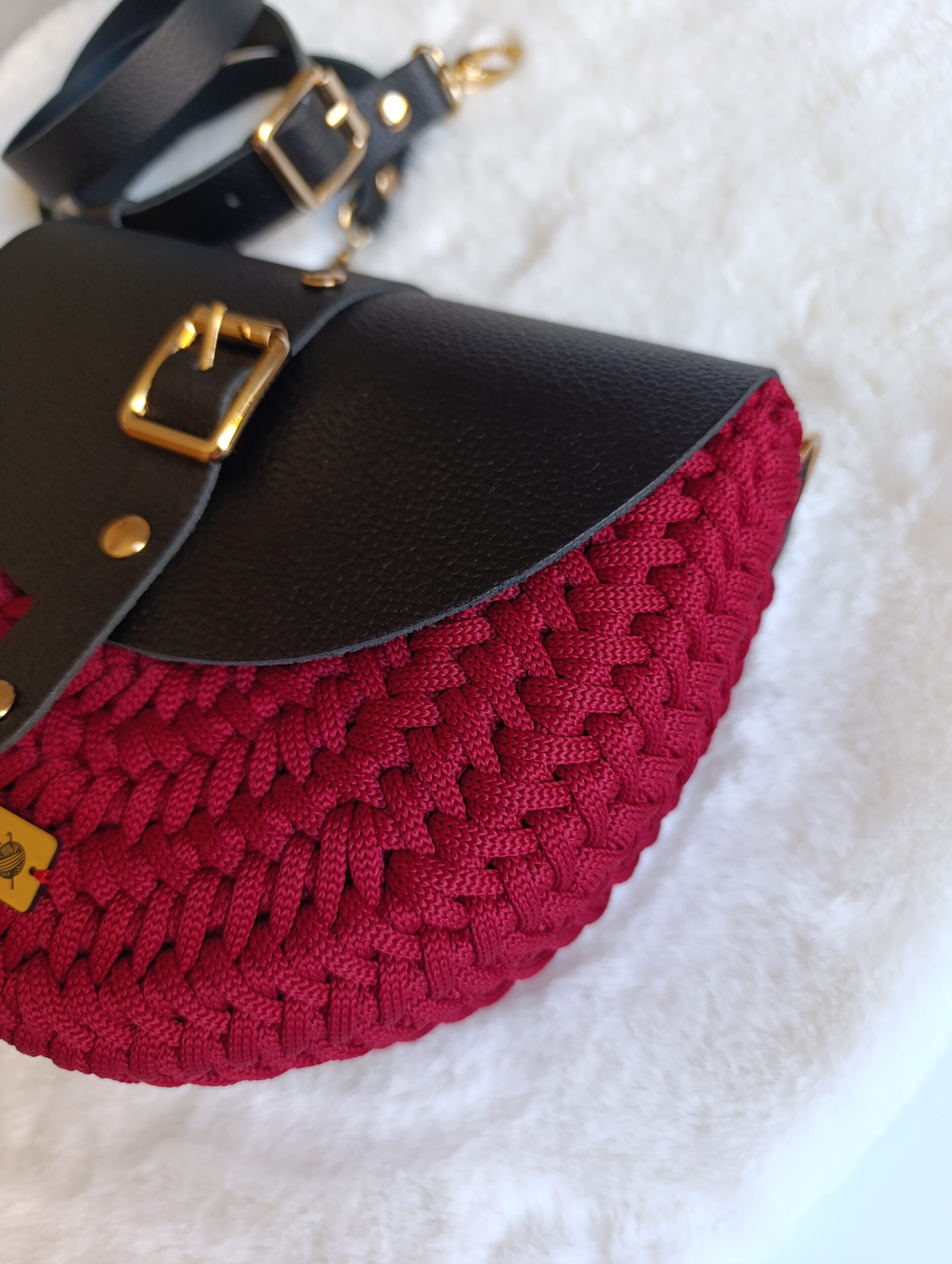 Model ręcznie szydełkowany, z elementami ze skóry naturalnej.