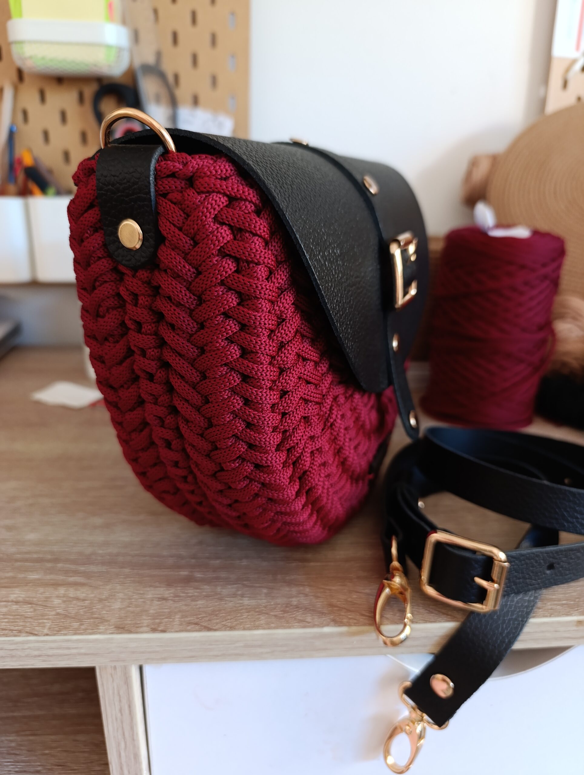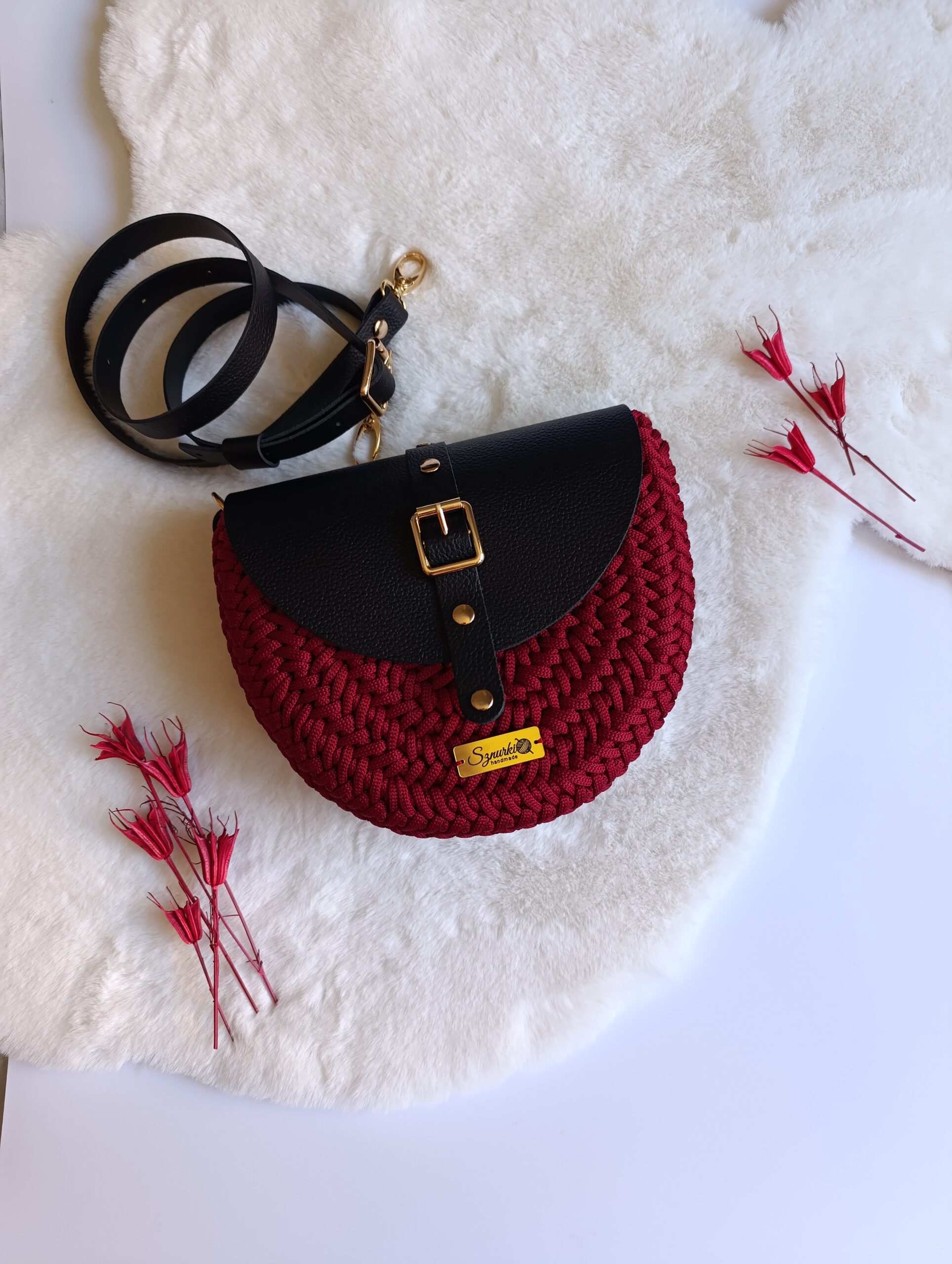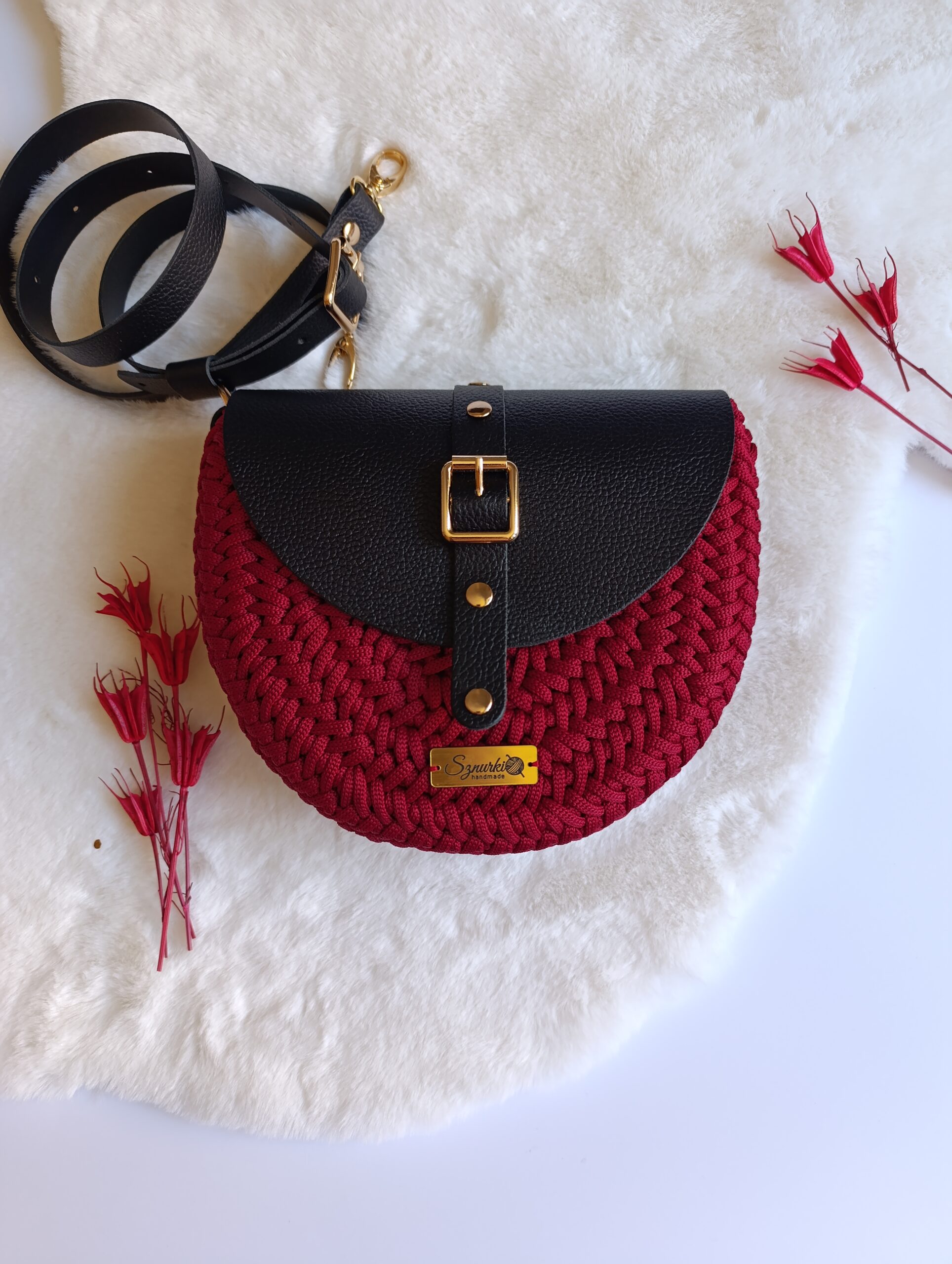 Model ręcznie szydełkowany, z elementami ze skóry naturalnej.