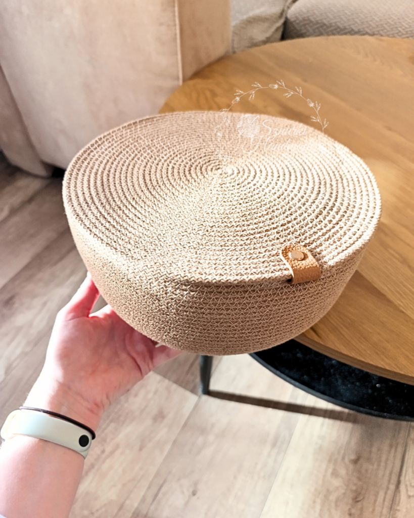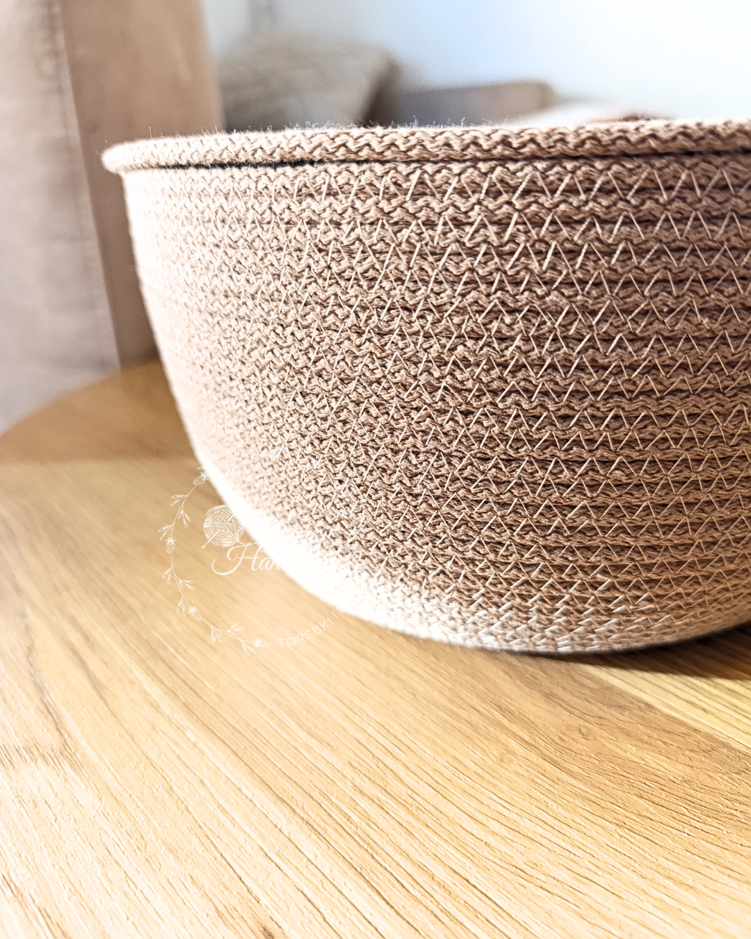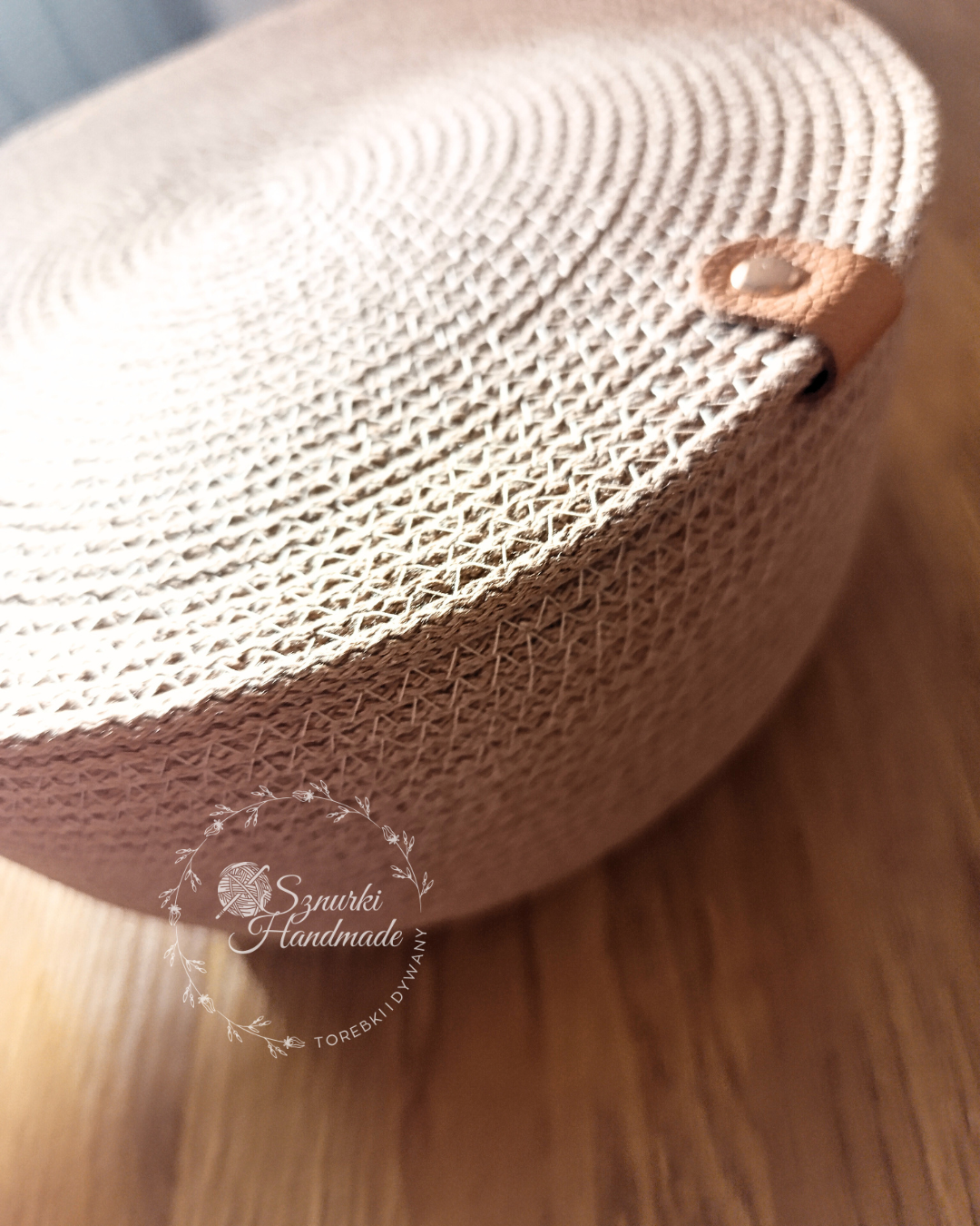 Stylowy i funkcjonalny kosz ręcznie szyty z wysokiej jakości sznurka bawełnianego.