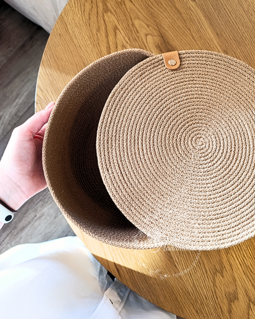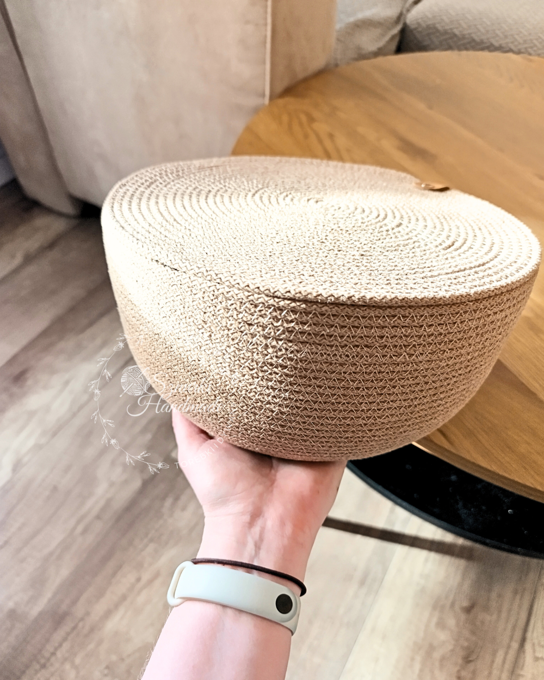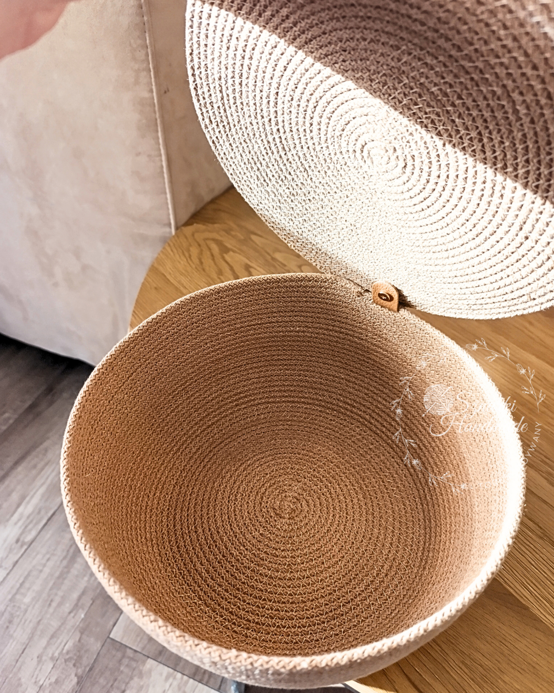 Stylowy i funkcjonalny kosz ręcznie szyty z wysokiej jakości sznurka bawełnianego.