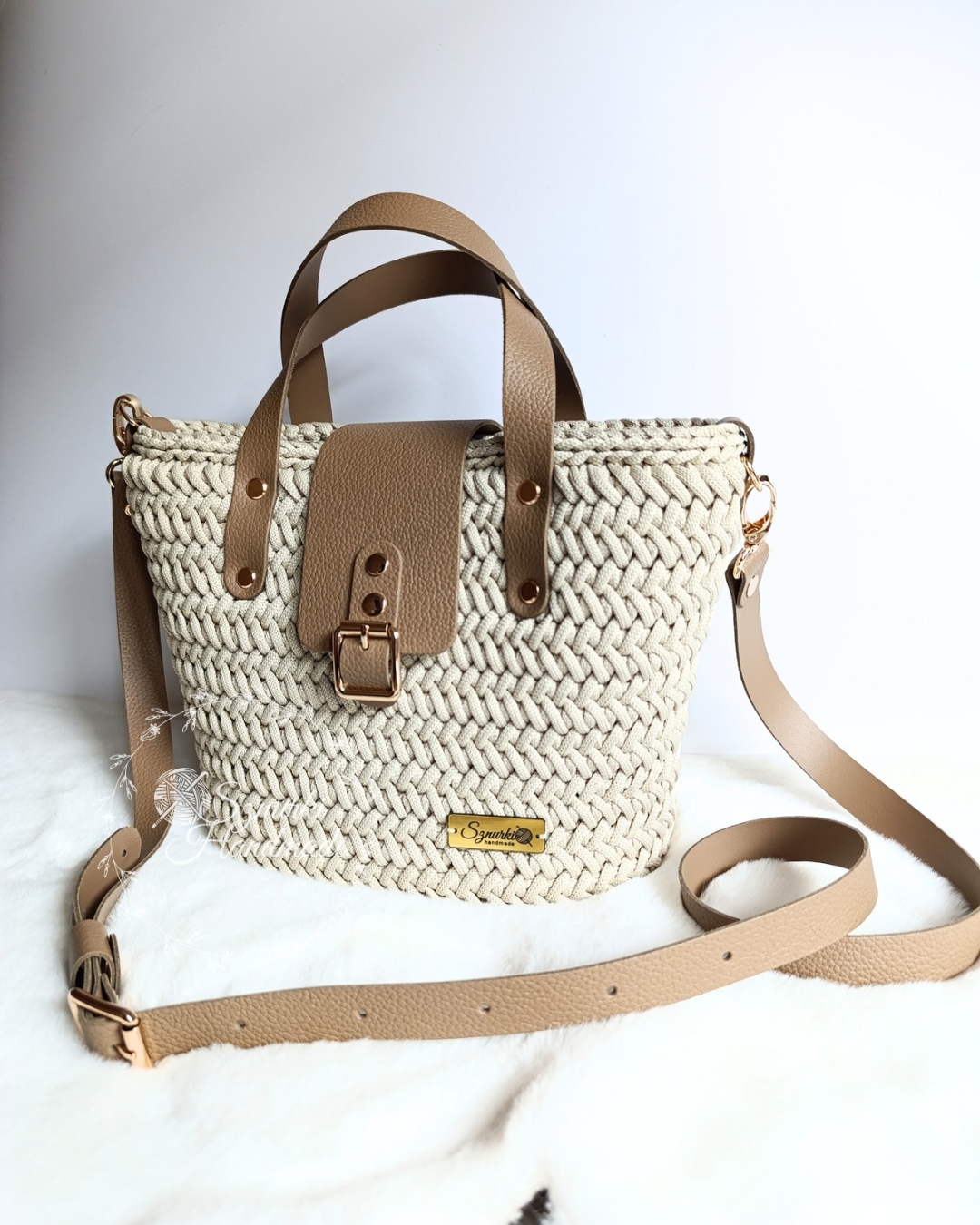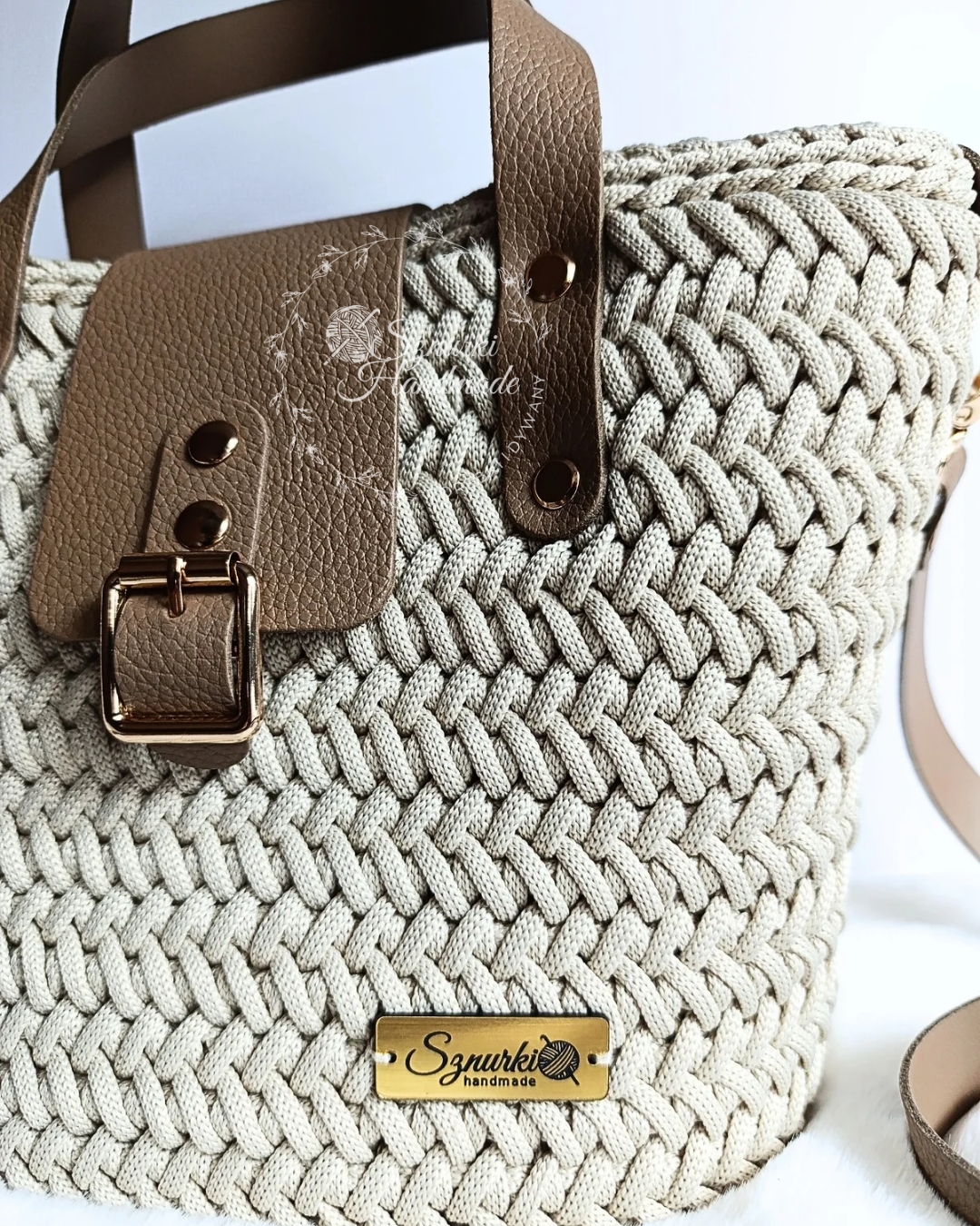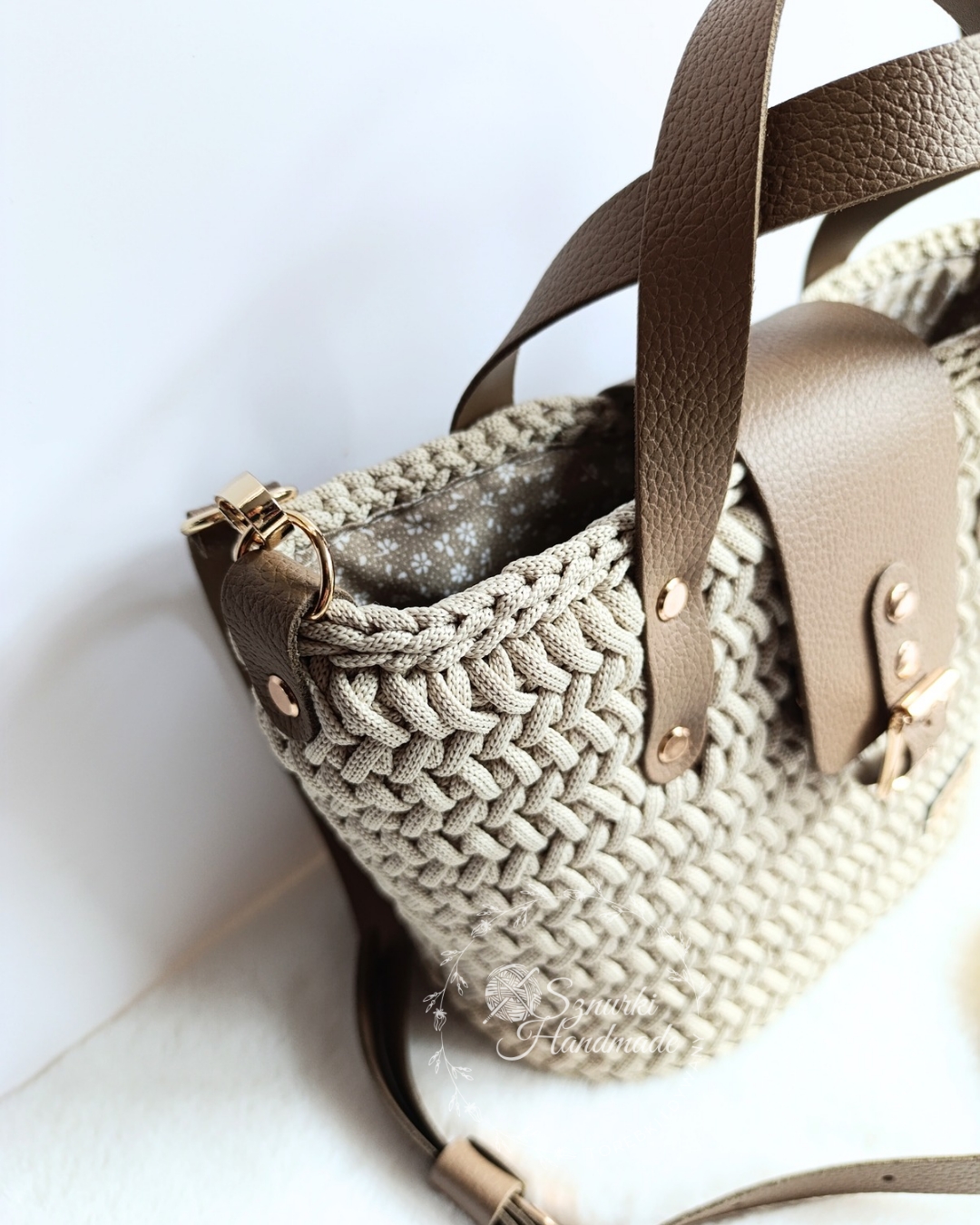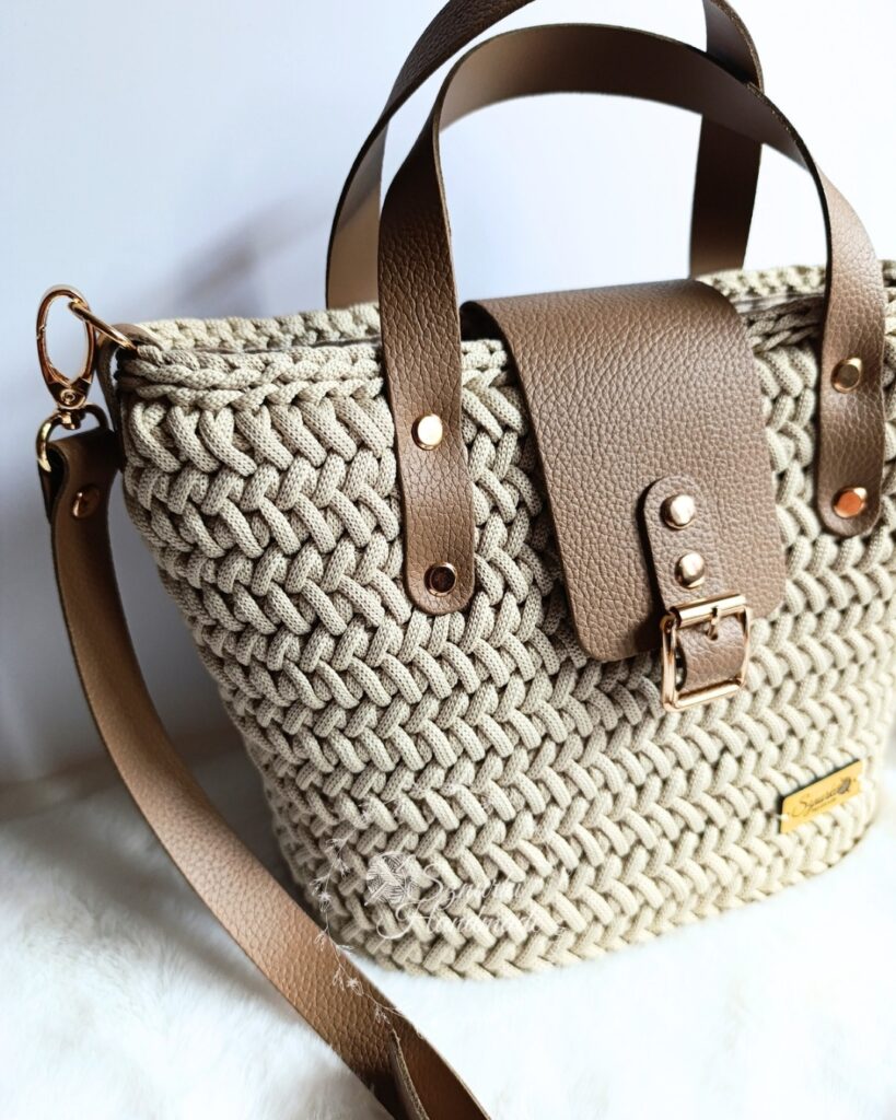 Ten ręcznie wykonany koszyk to połączenie lekkości, pojemności i niebanalnego stylu. Szydełkowany z najwyższą starannością, z dodatkiem skórzanych elementów, tworzy harmonijną całość.