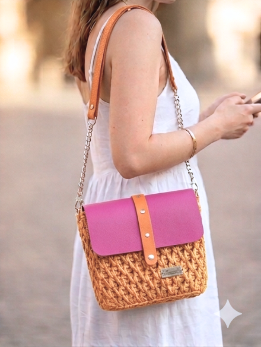 Klasyczna listonoszka o prostym, ponadczasowym kształcie. Minimalistyczna forma sprawia, że pasuje zarówno do codziennych stylizacji, jak i bardziej eleganckich zestawów. Prosta klapka została ozdobiona subtelnym paseczkiem z nitami, który dodaje całości charakteru, ale nie przytłacza formy. Nowy splot „plaster miodu” dodaje torebce charakteru. Pasek z łańcuszkiem nadaje lekkości i błysku.