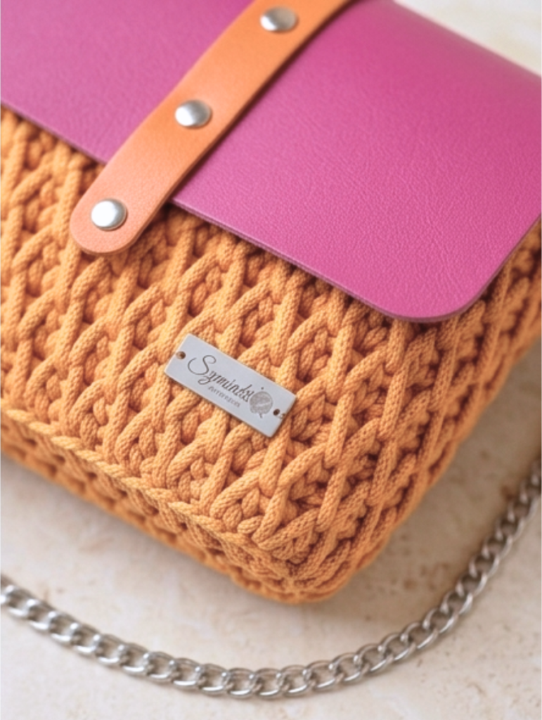 Model ręcznie szydełkowany, z elementami ze skóry naturalnej.