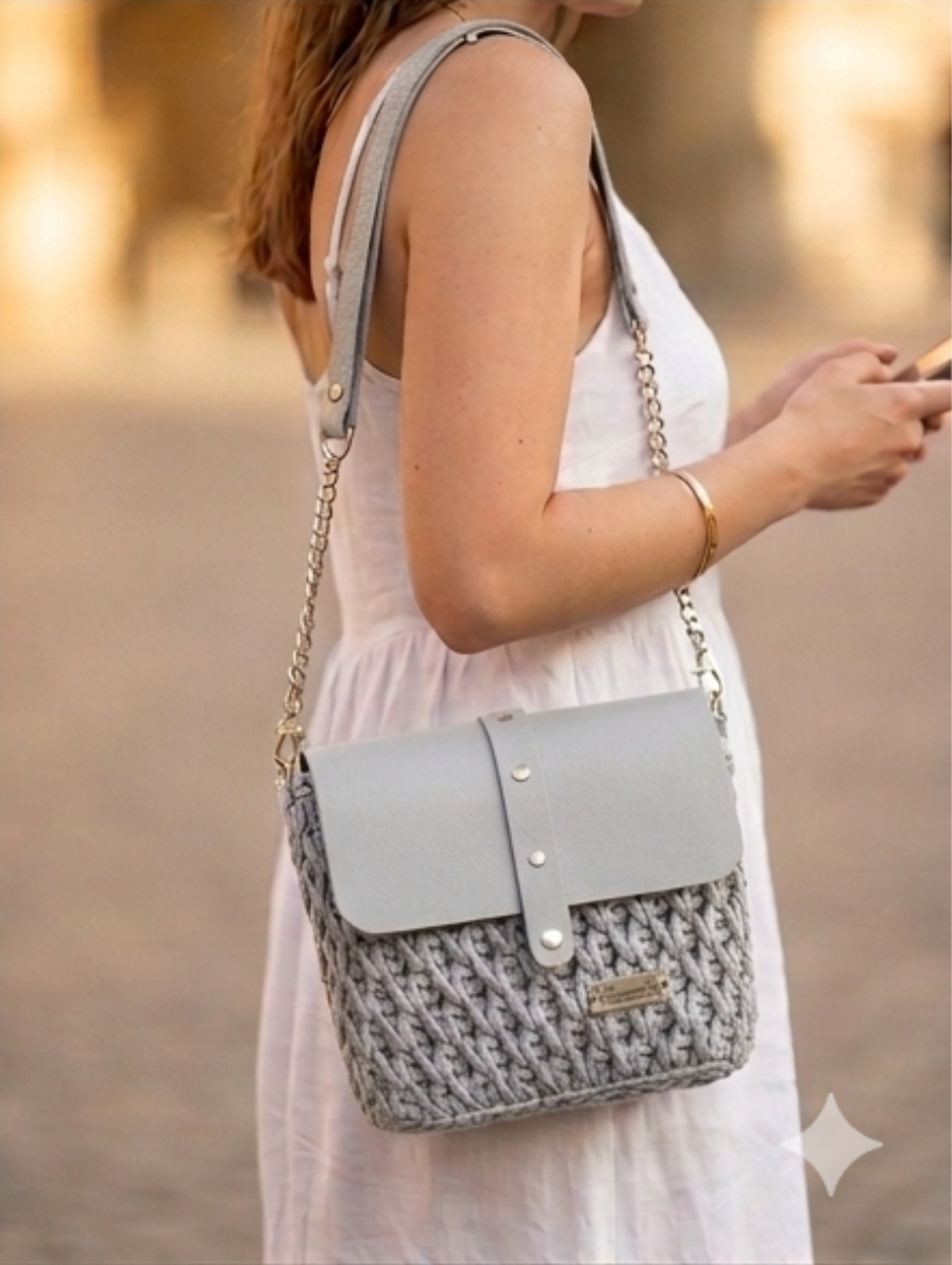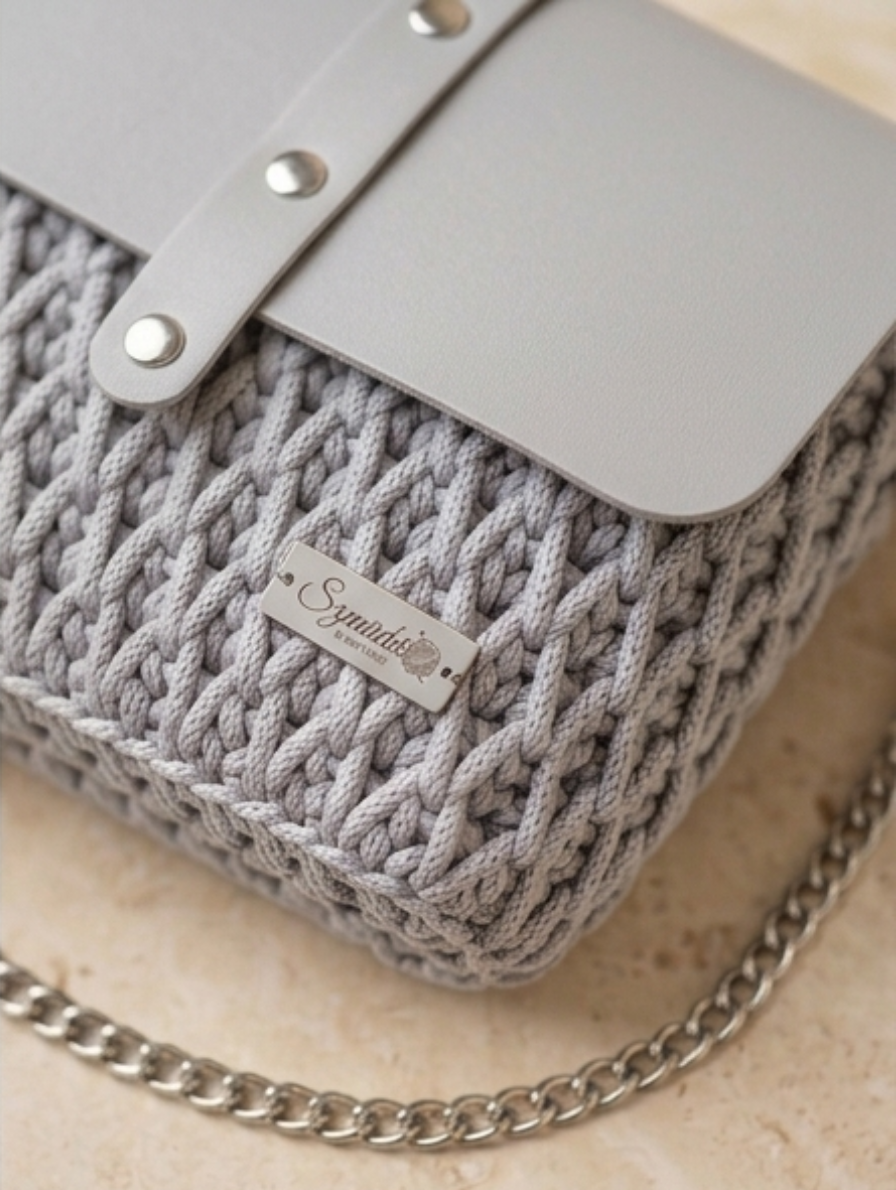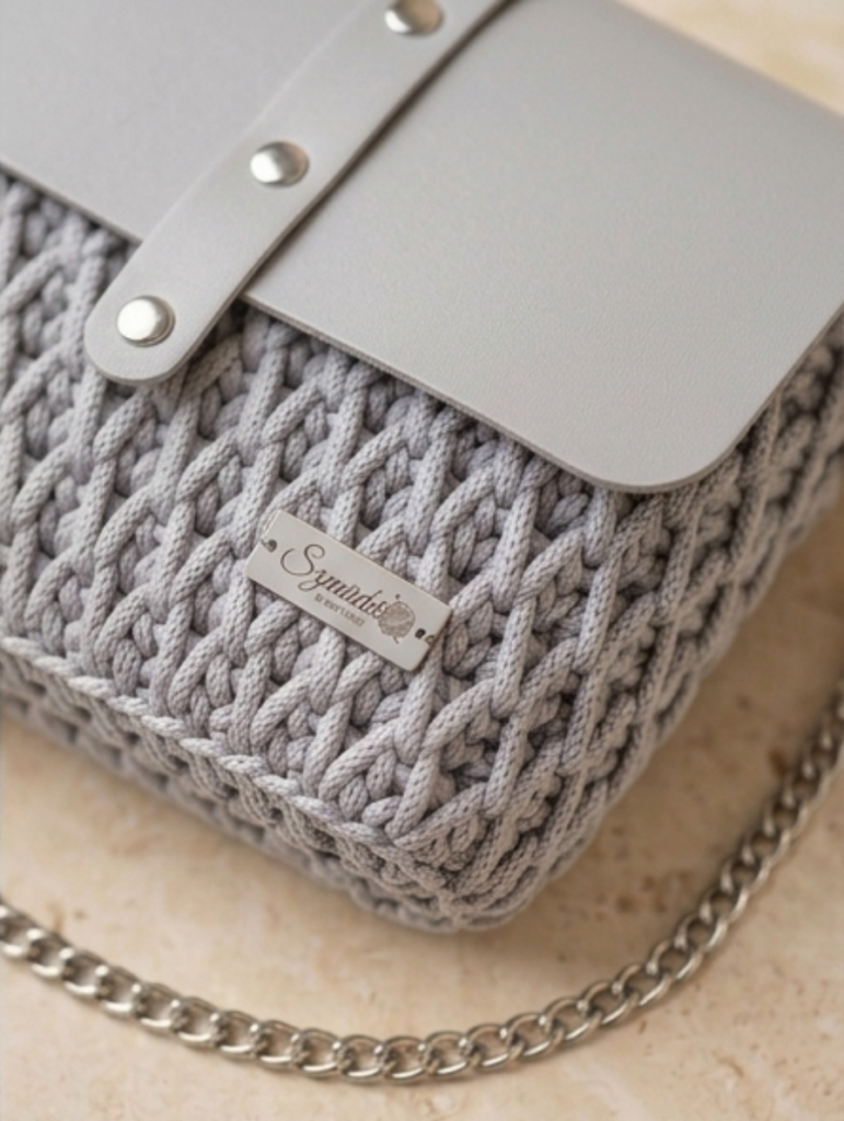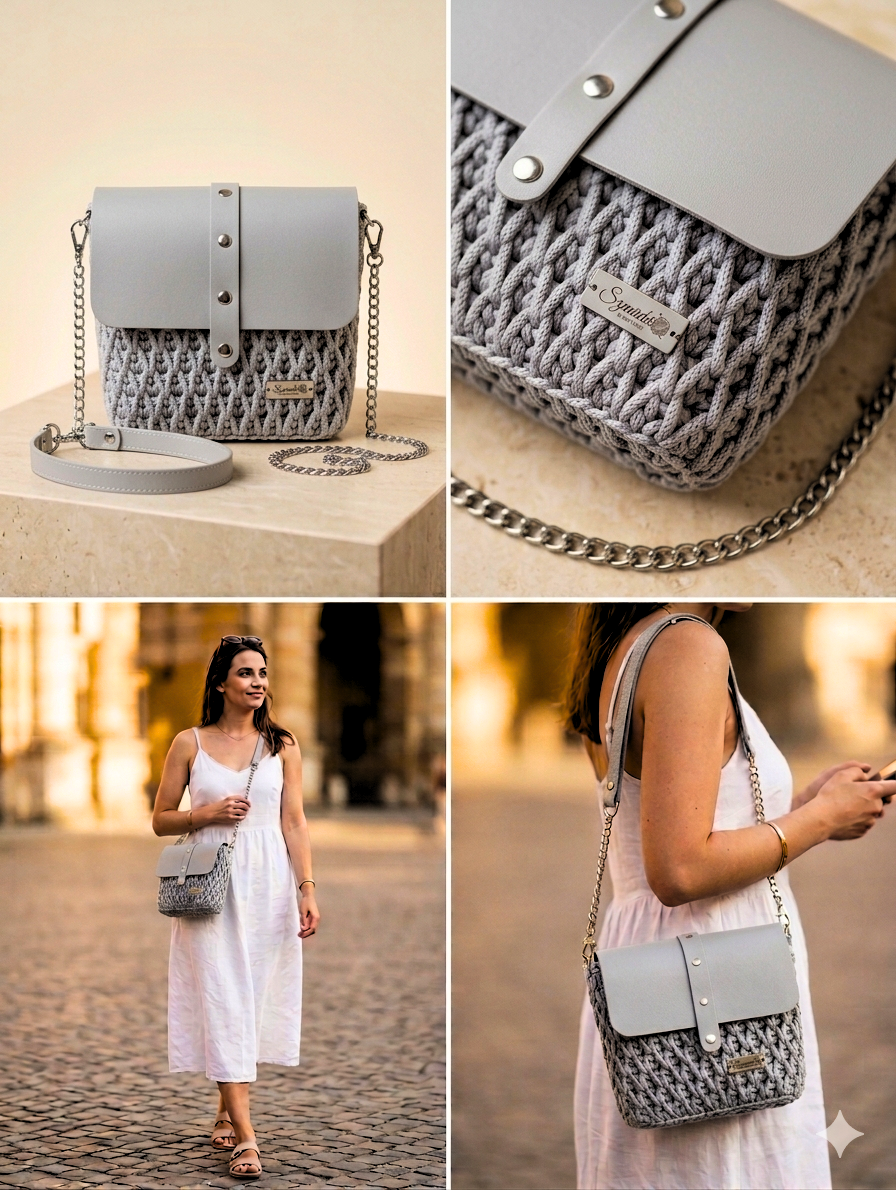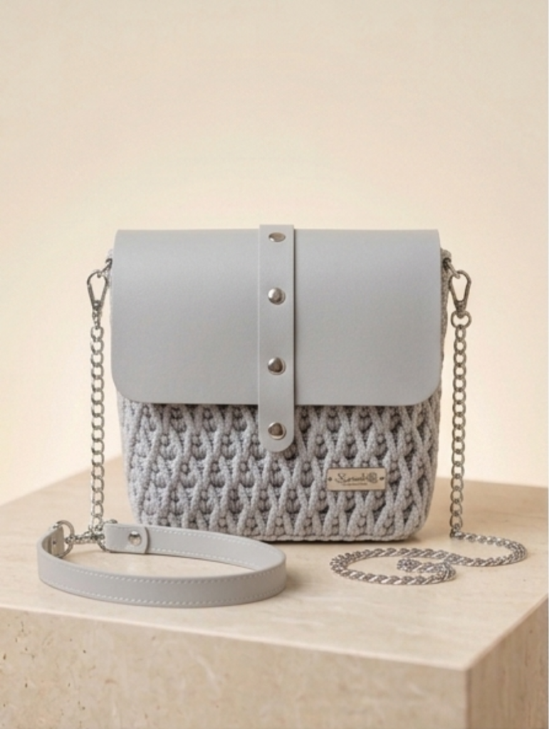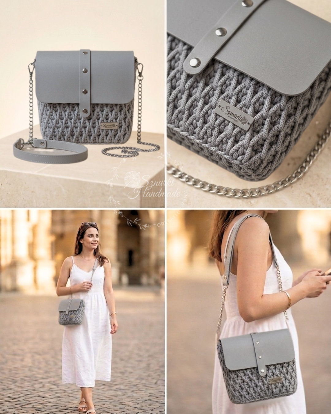 Model ręcznie szydełkowany, z elementami ze skóry naturalnej.
