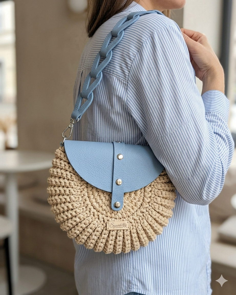 Model ręcznie szydełkowany, z elementami ze skóry naturalnej. Dobierz własne kolory! Znajdziesz je tutaj. Kolory rodzaj paska i opcję z podszewką lub bez wybierz przed dodaniem do koszyka.