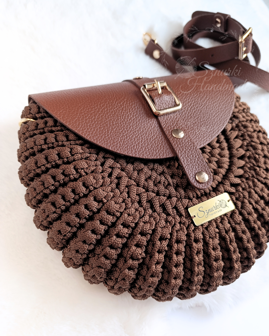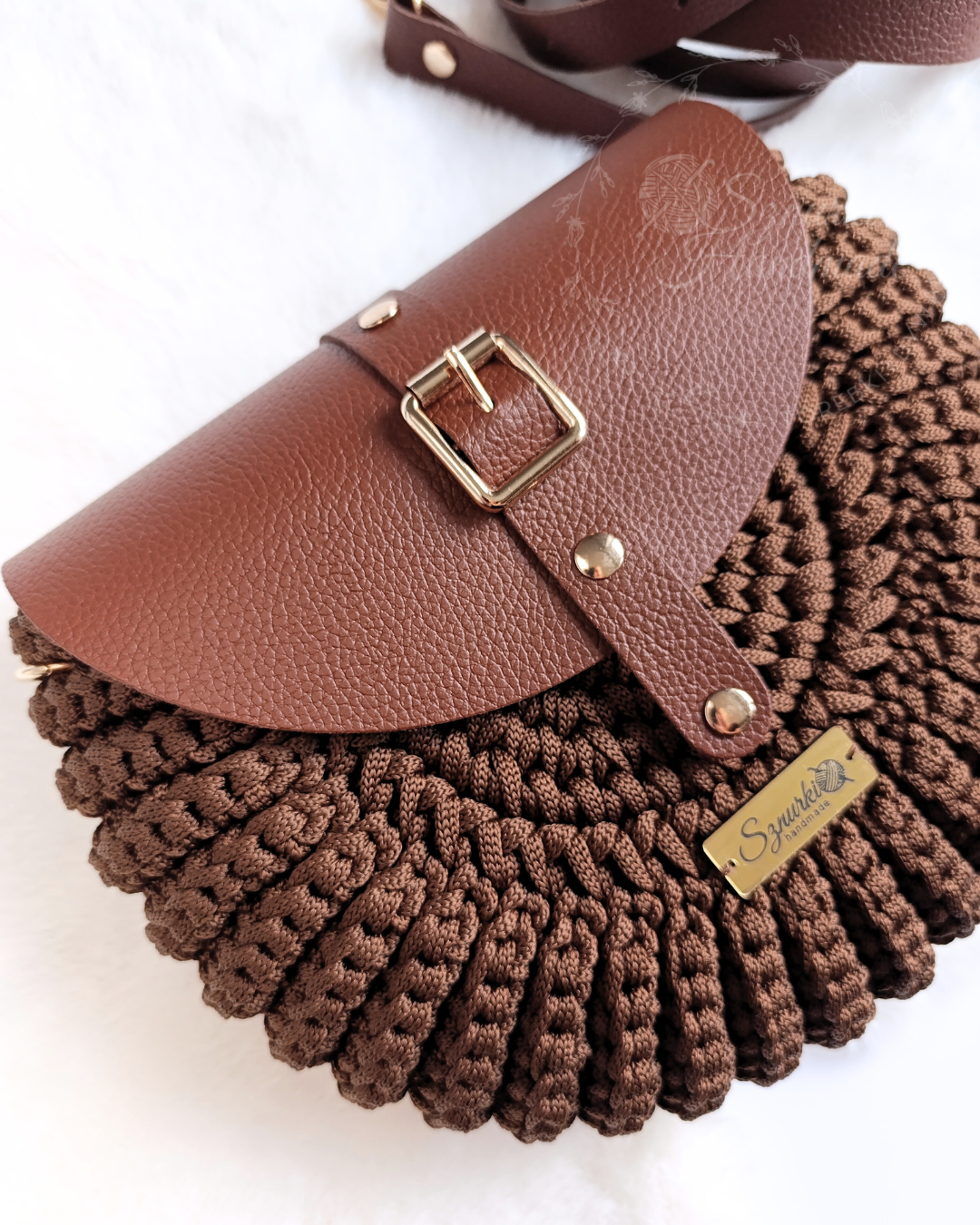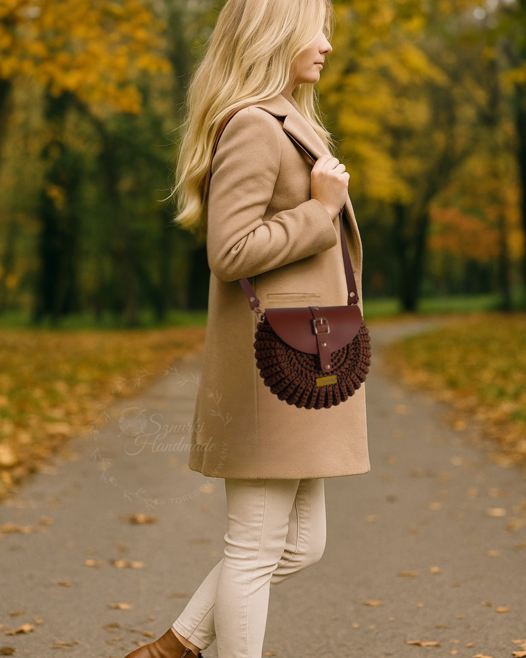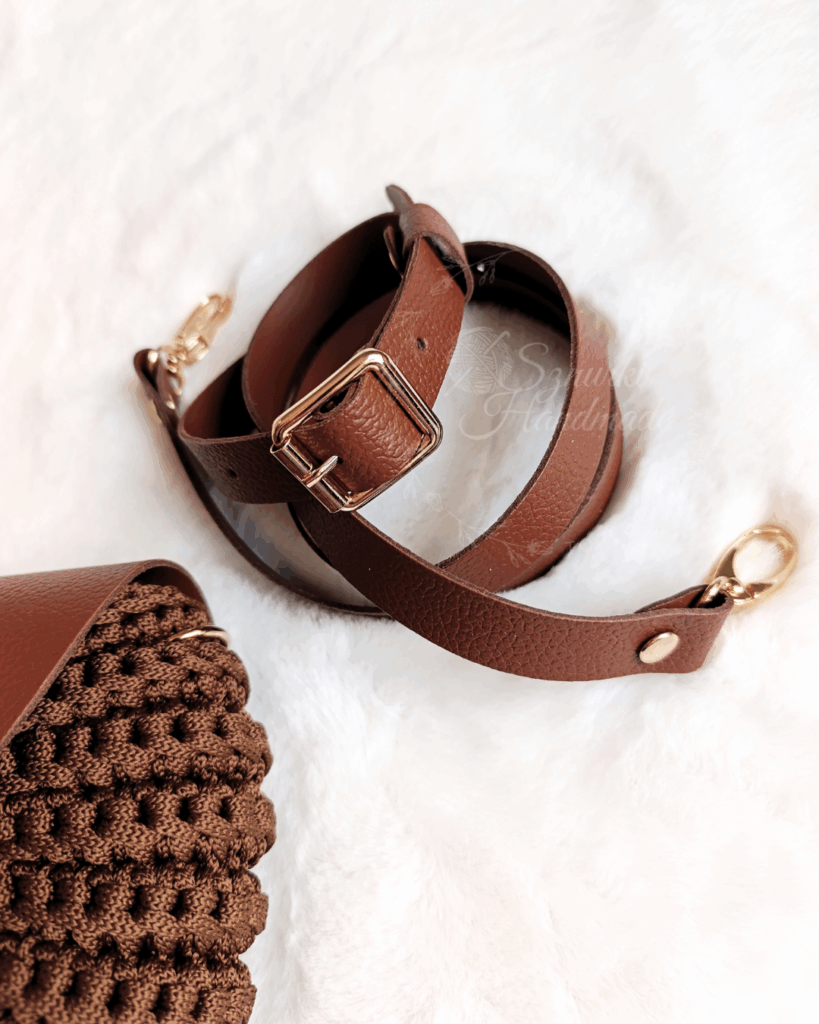 Model ręcznie szydełkowany, z elementami ze skóry naturalnej. Dobierz własne kolory! Znajdziesz je tutaj. Kolory rodzaj paska i opcję z podszewką lub bez wybierz przed dodaniem do koszyka.
