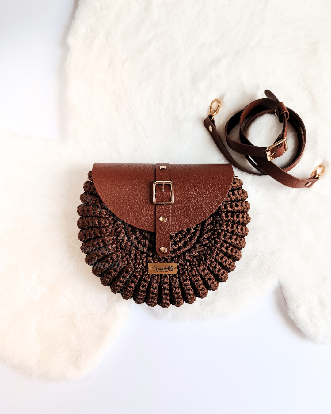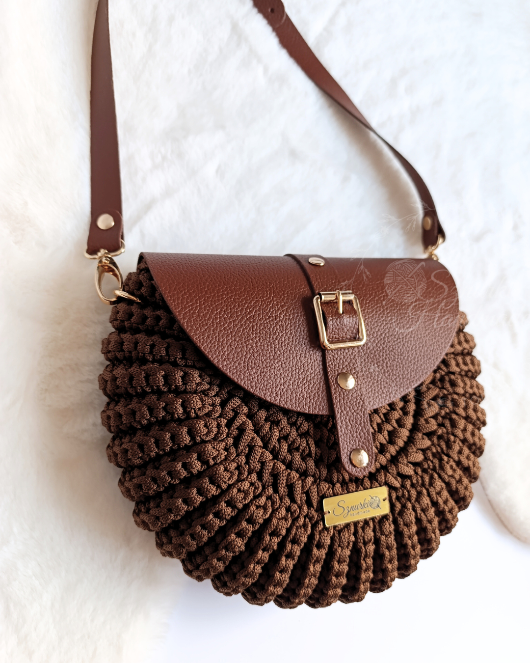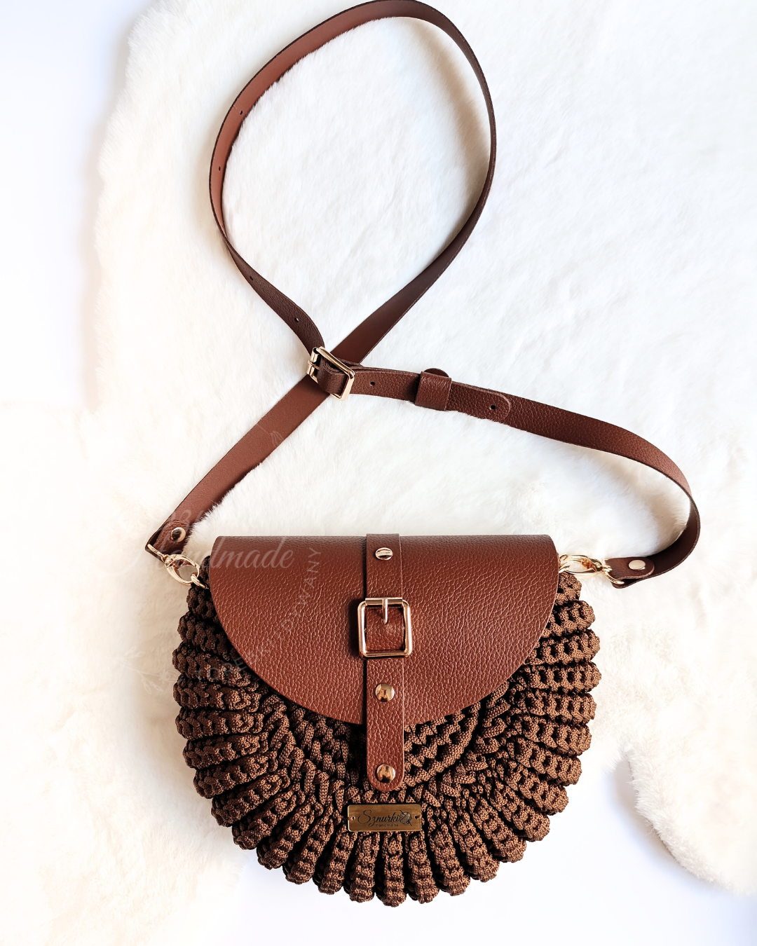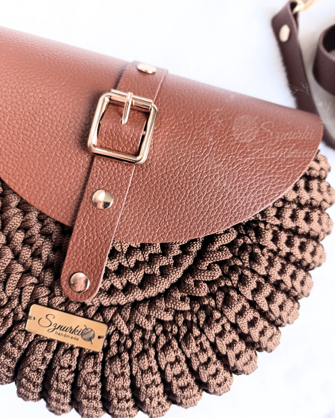 Model ręcznie szydełkowany, z elementami ze skóry naturalnej. Dobierz własne kolory! Znajdziesz je tutaj. Kolory rodzaj paska i opcję z podszewką lub bez wybierz przed dodaniem do koszyka.