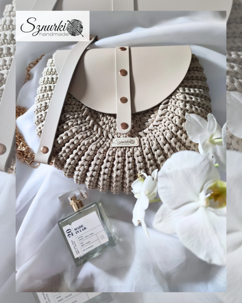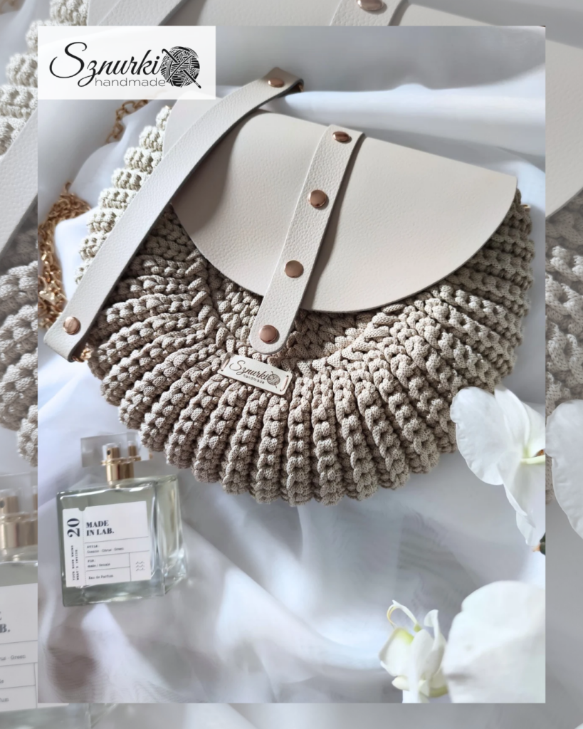 Model ręcznie szydełkowany, z elementami ze skóry naturalnej.