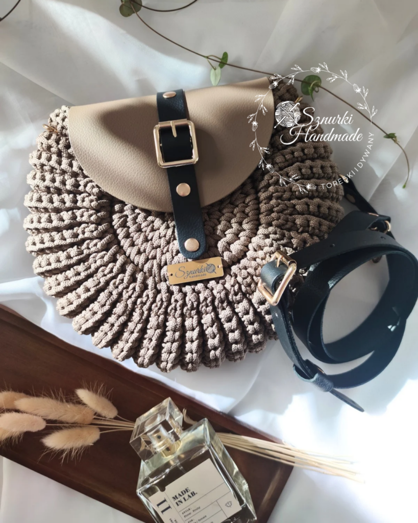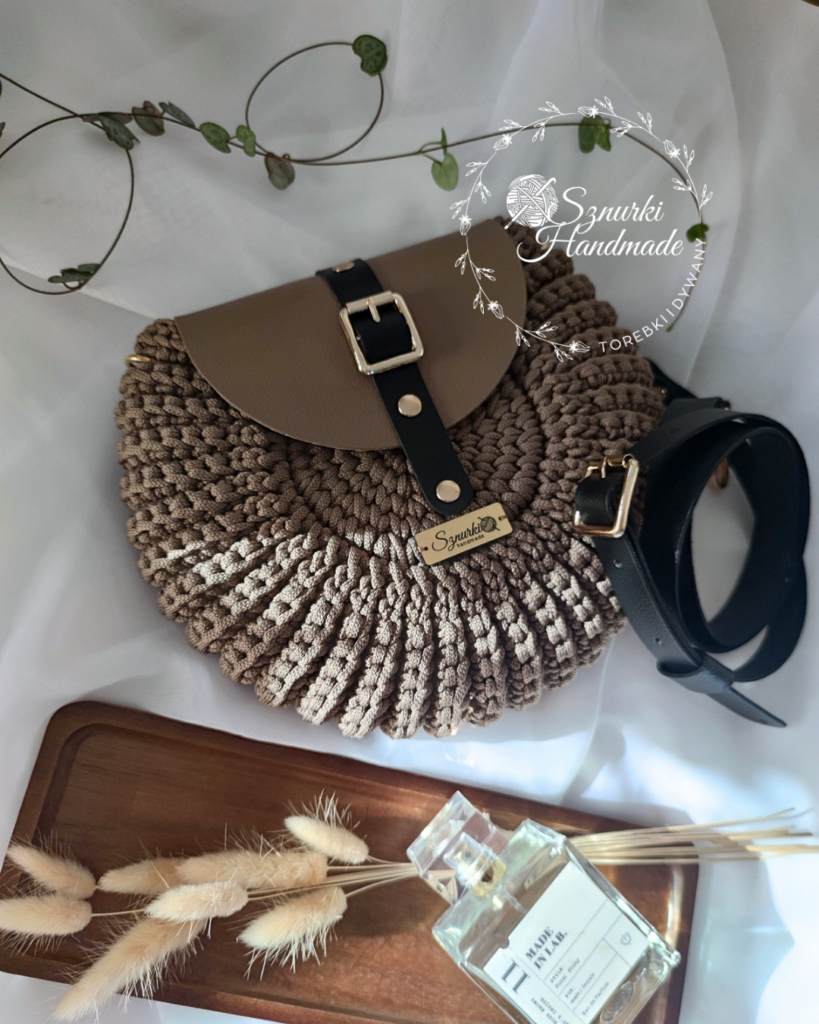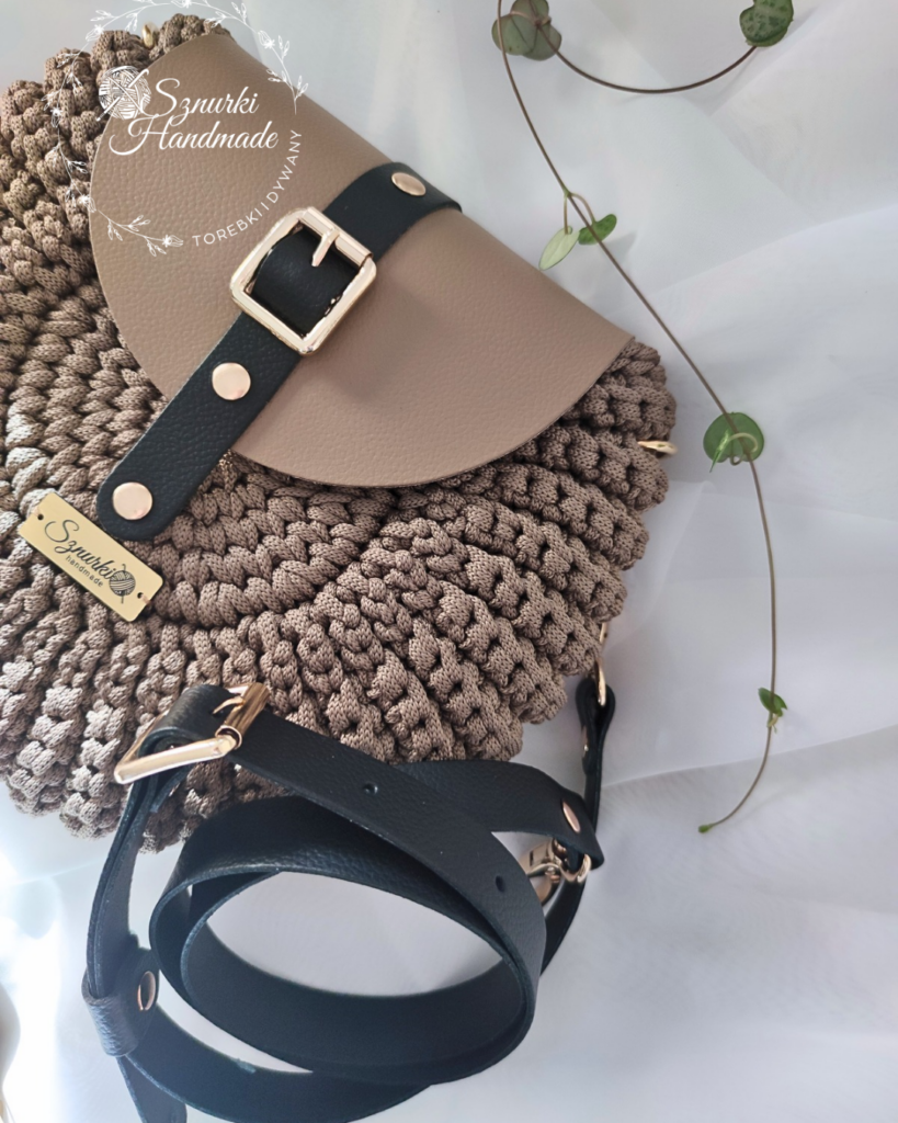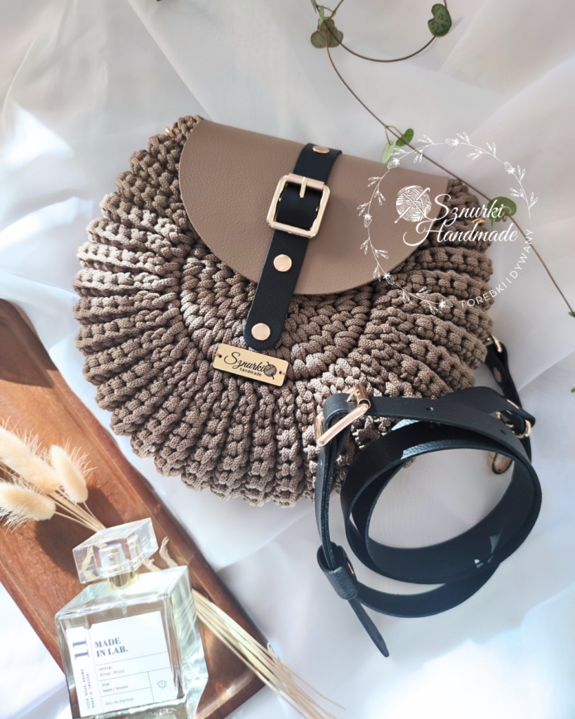 Model ręcznie szydełkowany, z elementami ze skóry naturalnej.