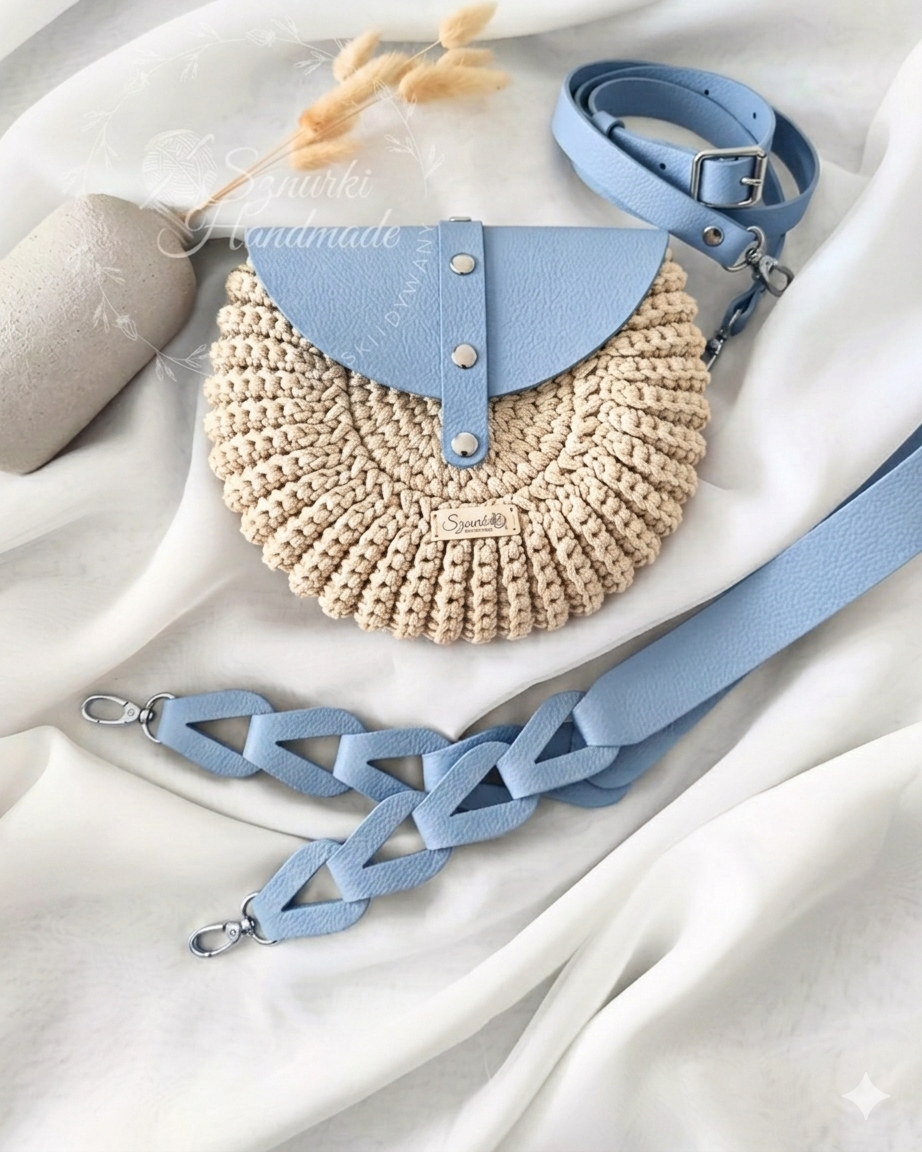 Model ręcznie szydełkowany, z elementami ze skóry naturalnej. Dobierz własne kolory! Znajdziesz je tutaj. Kolory rodzaj paska i opcję z podszewką lub bez wybierz przed dodaniem do koszyka.