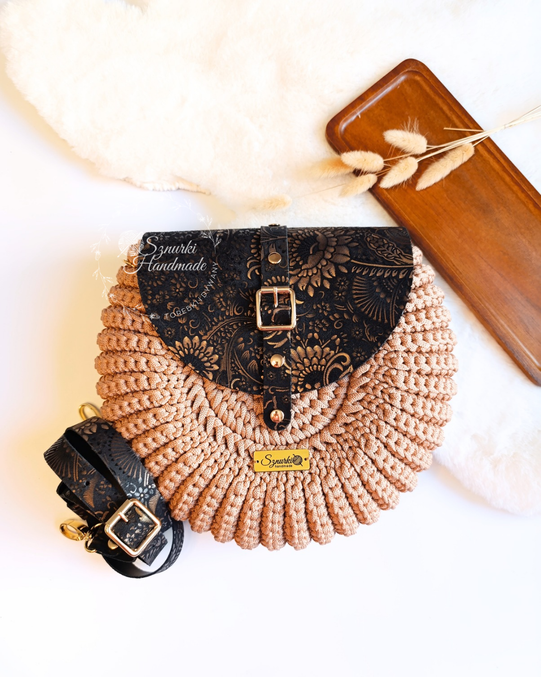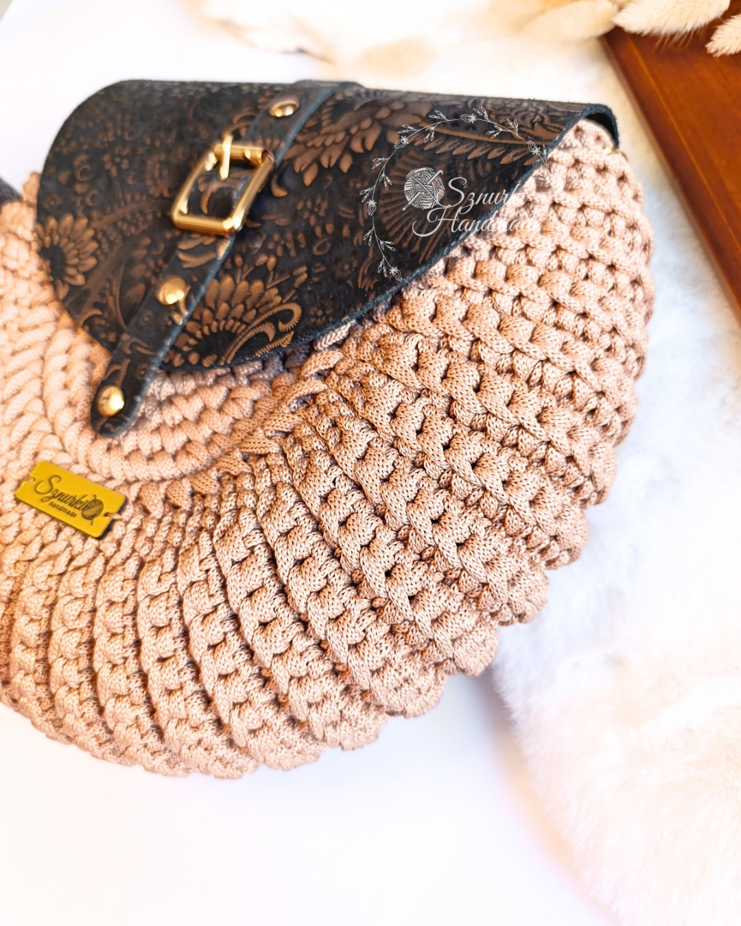 Model ręcznie szydełkowany, z elementami ze skóry naturalnej. Dobierz własne kolory! Znajdziesz je tutaj. Kolory rodzaj paska i opcję z podszewką lub bez wybierz przed dodaniem do koszyka.
