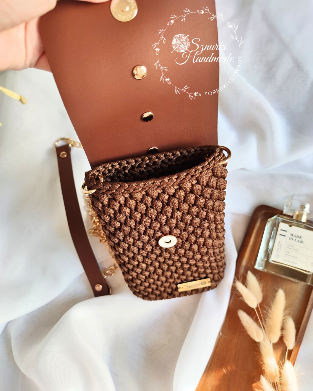Mini torebka Phone Bag to stylowy i funkcjonalny dodatek, ręcznie szydełkowany z dbałością o każdy detal. Z elementami ze skóry naturalnej, łączy elegancję z trwałością. Jej kompaktowy rozmiar idealnie mieści najpotrzebniejsze drobiazgi, takie jak telefon, klucze czy pomadka. To doskonała opcja na co dzień, gdy chcesz mieć pod ręką tylko to, co najważniejsze, nie rezygnując przy tym z modnego wyglądu. Pasek skórzany z łańcuszkiem dodaje lekkości i elegancji.