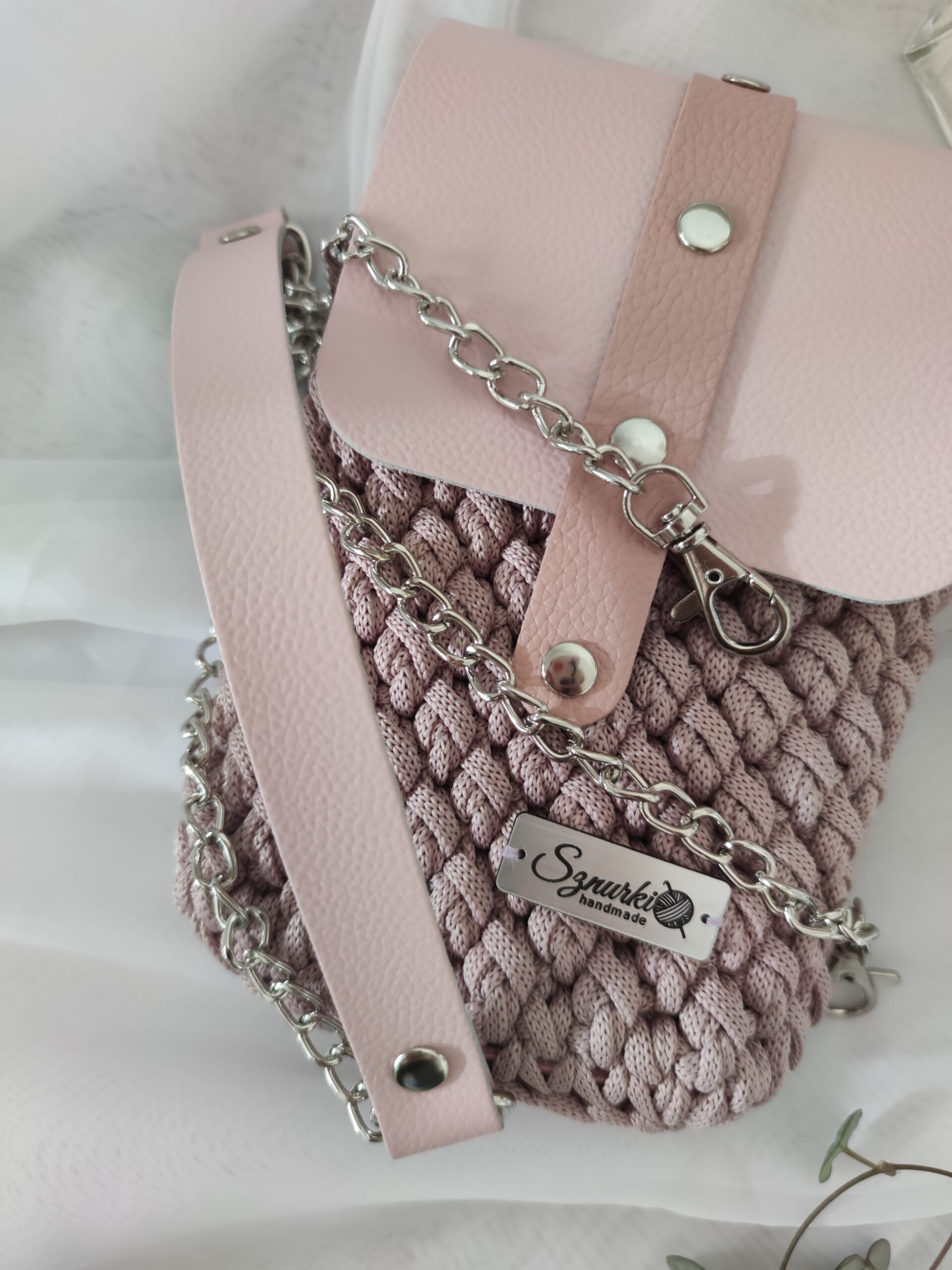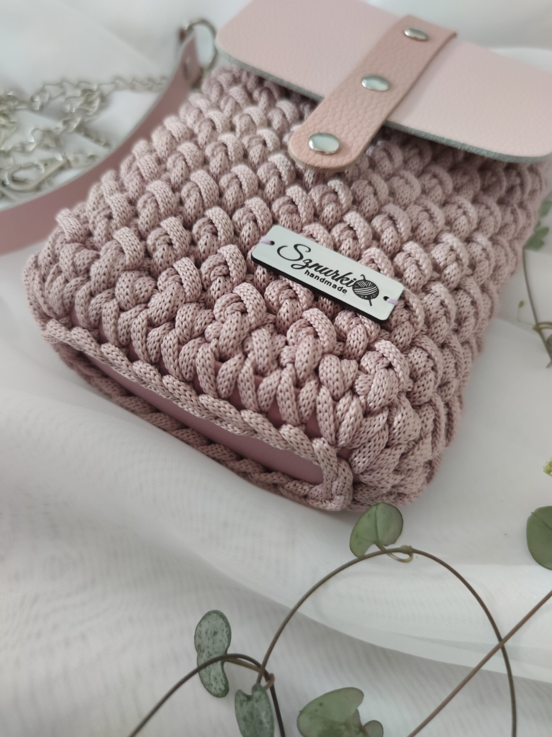 Model ręcznie szydełkowany, z elementami ze skóry naturalnej.