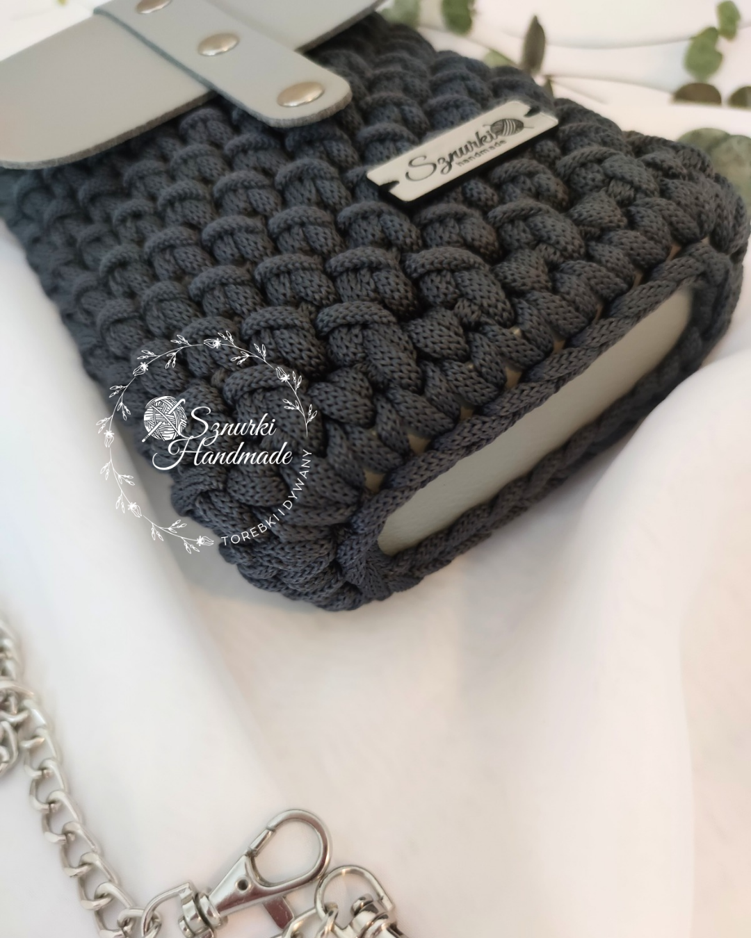 Model ręcznie szydełkowany, z elementami ze skóry naturalnej.