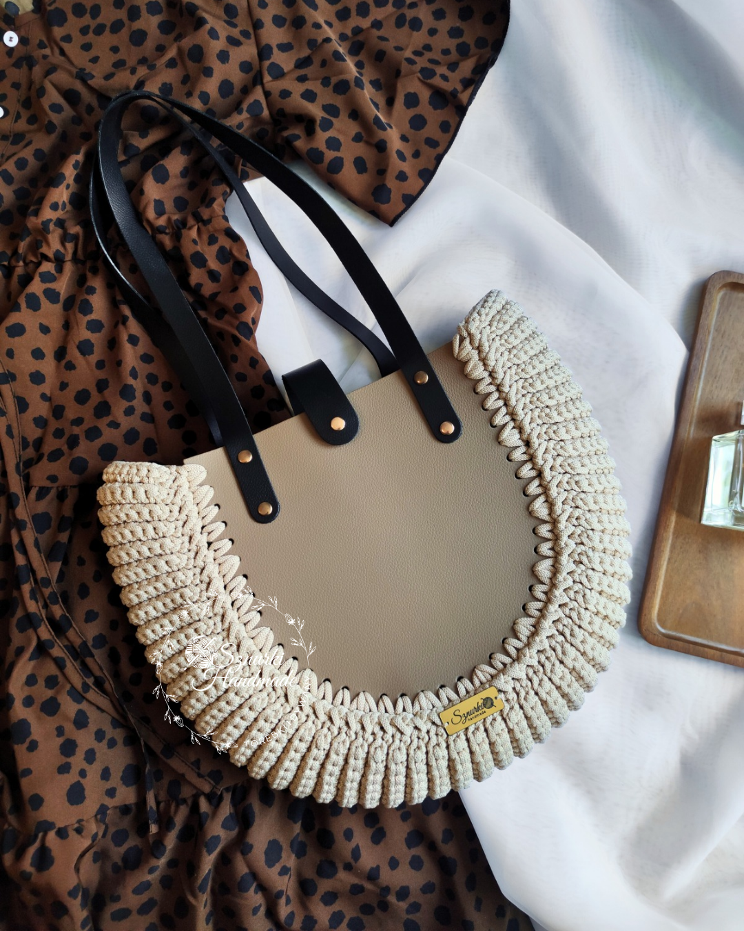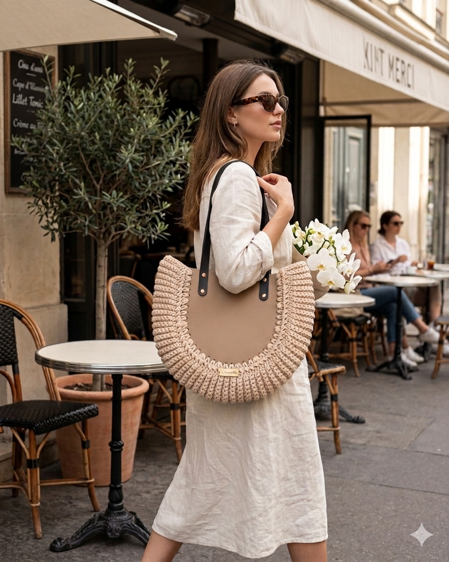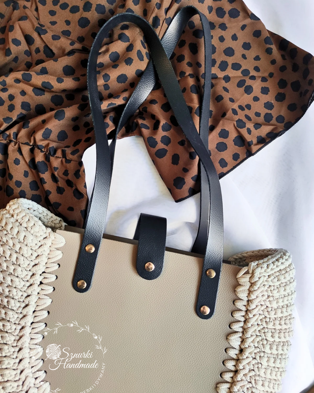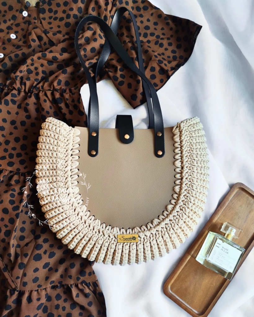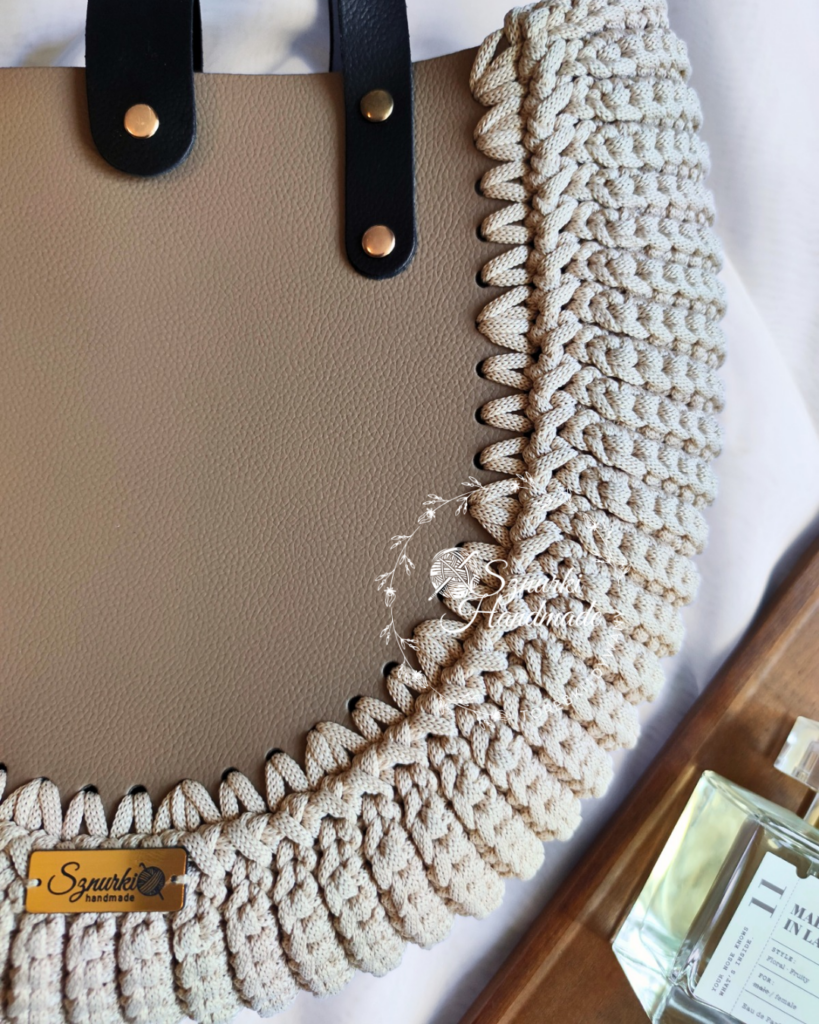 Wykonana ręcznie na szydełku, z solidną bazą ze skóry naturalnej, zapewnia zarówno trwałość, jak i elegancki wygląd.